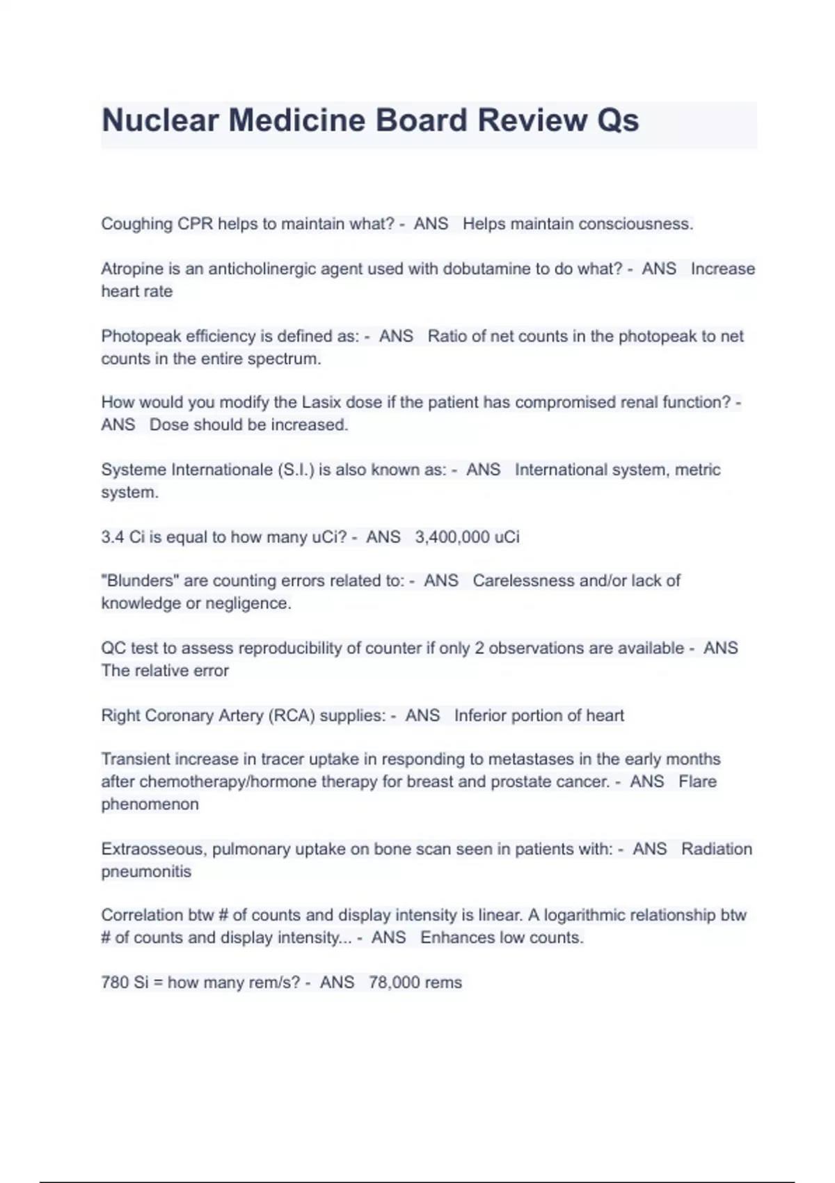 Nuclear Medicine Board Review Qs / Exam Questions And Answers Coughing CPR helps to maintain what? - ANS Helps maintain consciousness. Atropine is an anticholinergic agent used with dobutamine to do what? - ANS Increase heart rate Photopeak efficiency is defined as: - ANS Ratio of net counts in the photopeak to net counts in the entire spectrum. How would you modify the Lasix dose if the patient has compromised renal function? - ANS Dose should be increased. Systeme Internationale (S.I.) is also known as: - ANS International system, metric system. 3.4 Ci is equal to how many uCi? - ANS 3,400,000 uCi "Blunders" are counting errors related to: - ANS Carelessness and/or lack of knowledge or negligence. QC test to assess reproducibility of counter if only 2 observations are available - ANS The relative error Right Coronary Artery (RCA) supplies: - ANS Inferior portion of heart Transient increase in tracer uptake in responding to metastases in the early months after chemotherapy/hormone therapy for breast and prostate cancer. - ANS Flare phenomenon Extraosseous, pulmonary uptake on bone scan seen in patients with: - ANS Radiation pneumonitis Correlation btw # of counts and display intensity is linear. A logarithmic relationship btw # of counts and display intensity... - ANS Enhances low counts. 780 Si = how many rem/s? - ANS 78,000 rems