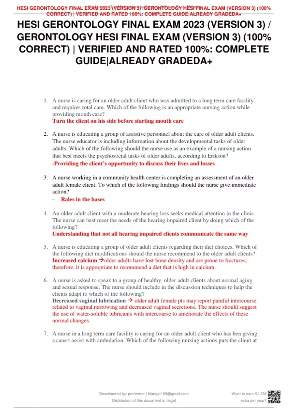 HESI GERONTOLOGY FINAL EXAM 2023 (VERSION 3) / GERONTOLOGY HESI FINAL EXAM (VERSION 3) (100% CORRECT) | VERIFIED AND RATED 100%: COMPLETE GUIDE|ALREADY GRADEDA+