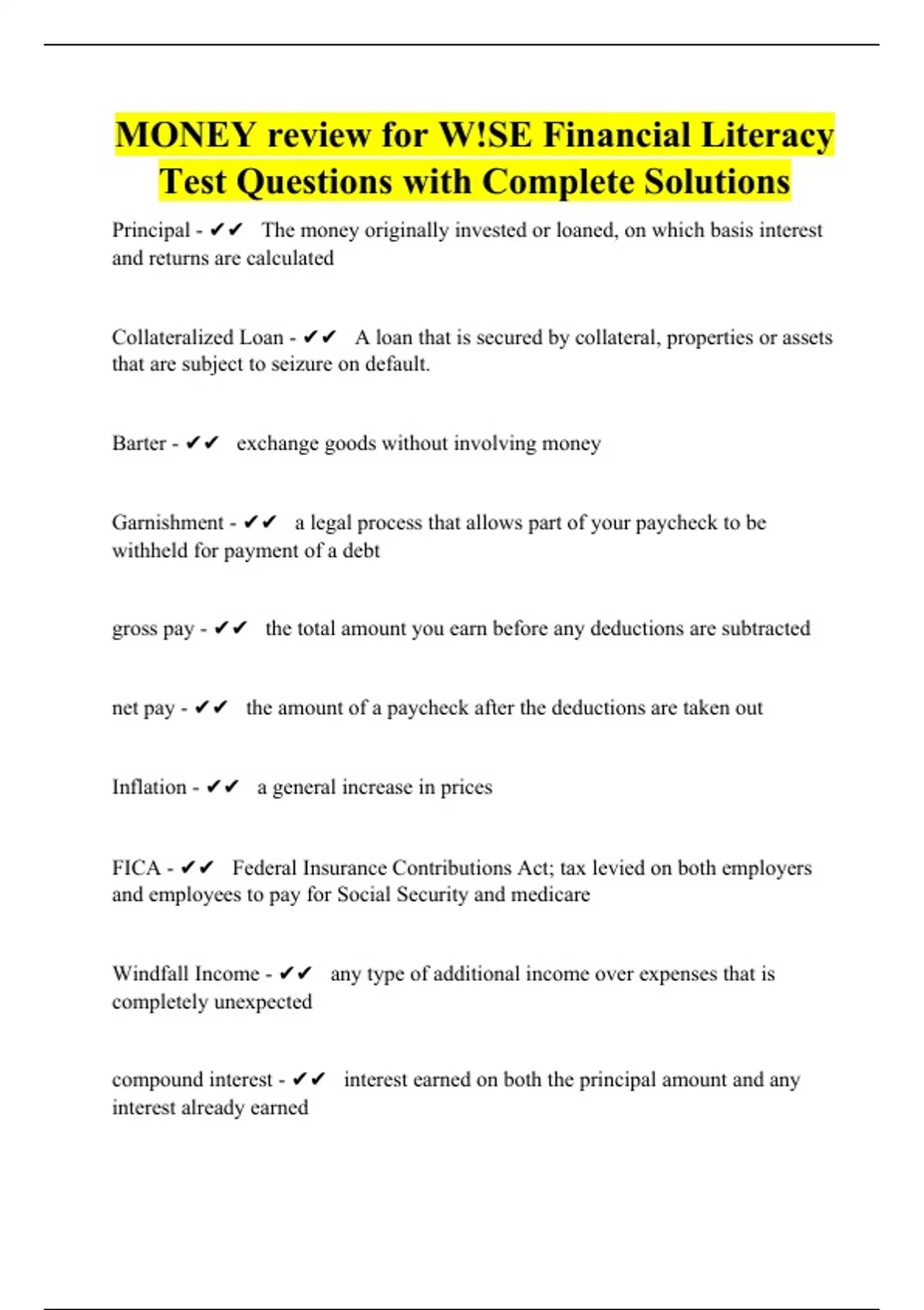 MONEY review for W!SE Financial Literacy Test Questions with Complete Solutions