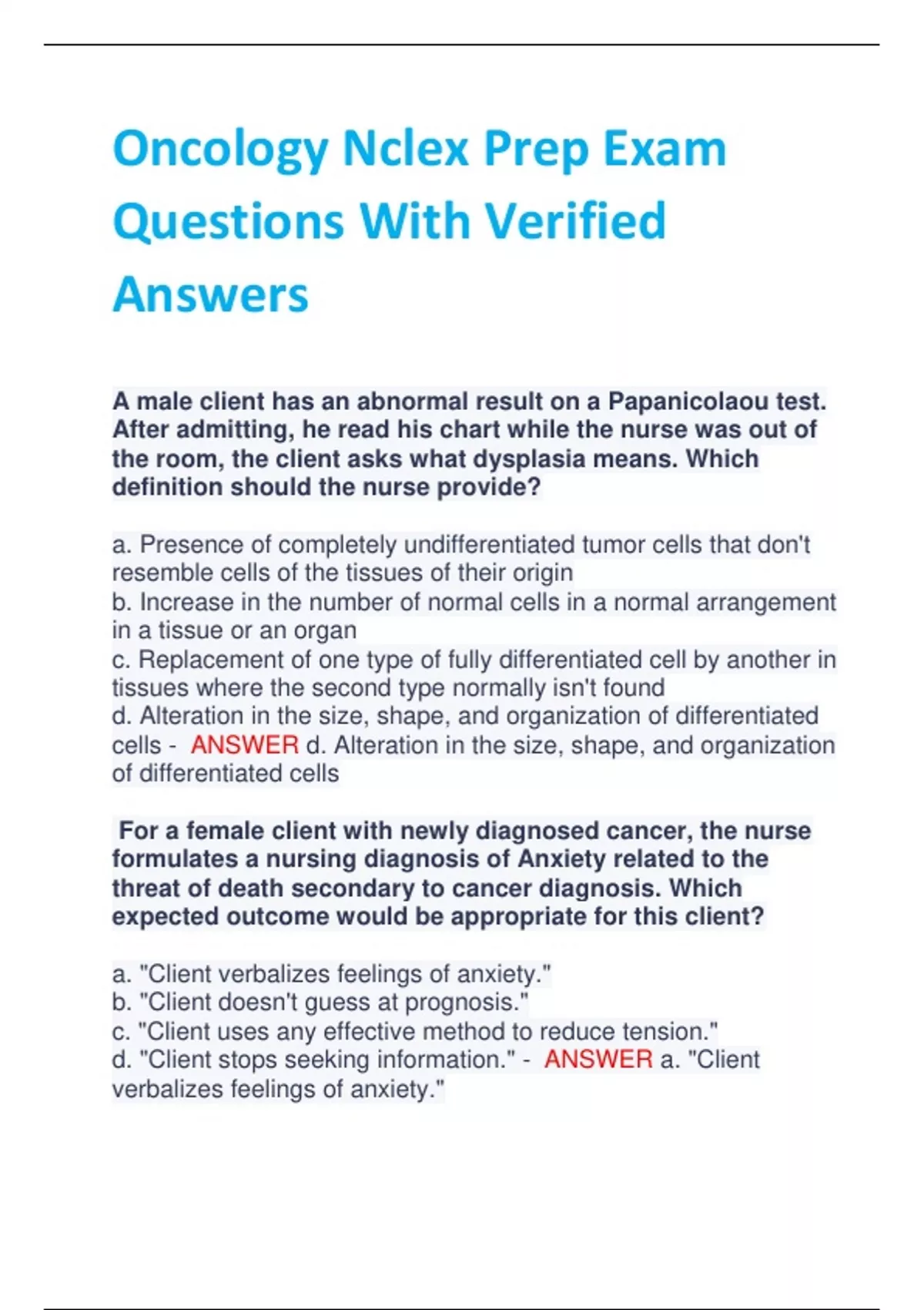 Oncology Nclex Prep Exam Questions With Verified Answers A male client has an abnormal result on a Papanicolaou test. After admitting, he read his chart while the nurse was out of the room, the client asks what dysplasia means. Which definition should the nurse provide? a. Presence of completely undifferentiated tumor cells that don't resemble cells of the tissues of their origin b. Increase in the number of normal cells in a normal arrangement in a tissue or an organ c. Replacement of one type of fully differentiated cell by another in tissues where the second type normally isn't found d. Alteration in the size, shape, and organization of differentiated cells - ANSWER d. Alteration in the size, shape, and organization of differentiated cells For a female client with newly diagnosed cancer, the nurse formulates a nursing diagnosis of Anxiety related to the threat of death secondary to cancer diagnosis. Which expected outcome would be appropriate for this client? a. "Client verbalizes feelings of anxiety." b. "Client doesn't guess at prognosis." c. "Client uses any effective method to reduce tension." d. "Client stops seeking information." - ANSWER a. "Client verbalizes feelings of anxiety." A male client with a cerebellar brain tumor is admitted to an acute care facility. The nurse formulates a nursing diagnosis of Risk for injury. Which "related-to" phrase should the nurse add to complete the nursing diagnosis statement? a. Related to visual field deficits b. Related to difficulty swallowing c. Related to impaired balance d. Related to psychomotor seizures - ANSWER c. Related to impaired balance A female client with cancer is scheduled for radiation therapy. The nurse knows that radiation at any treatment site may cause a certain adverse effect. Therefore, the nurse should prepare the client to expect: a. hair loss. b. stomatitis. c. fatigue. d. vomiting. - ANSWER c. fatigue. Nurse April is teaching a client who suspects that she has a lump in her breast. The nurse instructs the client that a diagnosis of breast cancer is confirmed by: a. breast self-examination. b. mammography. c. fine needle aspiration. d. chest X-ray. - ANSWER c. fine needle aspiration. A male client undergoes a laryngectomy to treat laryngeal cancer. When teaching the client how to care for the neck stoma, the nurse should include which instruction? a. "Keep the stoma uncovered." b. "Keep the stoma dry." c. "Have a family member perform stoma care initially until you get used to the procedure." d. "Keep the stoma moist." - ANSWER d. "Keep the stoma moist." A female client is receiving chemotherapy to treat breast cancer. Which assessment finding indicates a fluid and electrolyte imbalance induced by chemotherapy? a. Urine output of 400 ml in 8 hours b. Serum potassium level of 3.6 mEq/L c. Blood pressure of 120/64 to 130/72 mm Hg d. Dry oral mucous membranes and cracked lips - ANSWER d. Dry oral mucous membranes and cracked lip