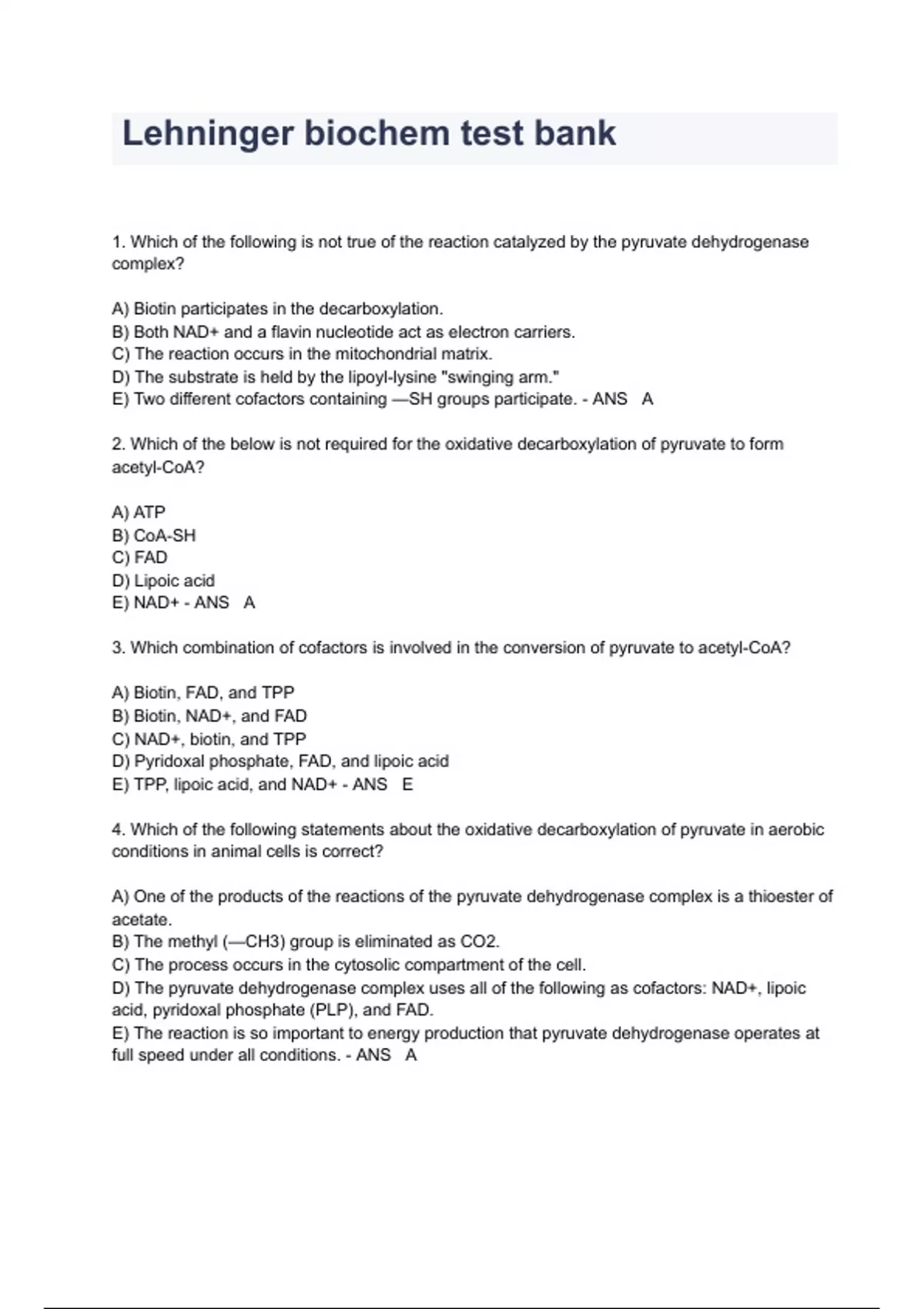 Lehninger biochem test bank 1. Which of the following is not true of the reaction catalyzed by the pyruvate dehydrogenase complex? A) Biotin participates in the decarboxylation. B) Both NAD+ and a flavin nucleotide act as electron carriers. C) The reaction occurs in the mitochondrial matrix. D) The substrate is held by the lipoyl-lysine "swinging arm." E) Two different cofactors containing —SH groups participate. - ANS A 2. Which of the below is not required for the oxidative decarboxylation of pyruvate to form acetyl-CoA? A) ATP B) CoA-SH C) FAD D) Lipoic acid E) NAD+ - ANS A 3. Which combination of cofactors is involved in the conversion of pyruvate to acetyl-CoA? A) Biotin, FAD, and TPP B) Biotin, NAD+, and FAD C) NAD+, biotin, and TPP D) Pyridoxal phosphate, FAD, and lipoic acid E) TPP, lipoic acid, and NAD+ - ANS E 4. Which of the following statements about the oxidative decarboxylation of pyruvate in aerobic conditions in animal cells is correct? A) One of the products of the reactions of the pyruvate dehydrogenase complex is a thioester of acetate. B) The methyl (—CH3) group is eliminated as CO2. C) The process occurs in the cytosolic compartment of the cell. D) The pyruvate dehydrogenase complex uses all of the following as cofactors: NAD+, lipoic acid, pyridoxal phosphate (PLP), and FAD. E) The reaction is so important to energy production that pyruvate dehydrogenase operates at full speed under all conditions. - ANS A 5. Glucose labeled with 14C in C-3 and C-4 is completely converted to acetyl-CoA via glycolysis and the pyruvate dehydrogenase complex. What percentage of the acetyl-CoA molecules formed will be labeled with 14C, and in which position of the acetyl moiety will the 14C label be found? A) 100% of the acetyl-CoA will be labeled at C-1 (carboxyl). B) 100% of the acetyl-CoA will be labeled at C-2. C) 50% of the acetyl-CoA will be labeled, all at C-2 (methyl). D) No label will be found in the acetyl-CoA molecules. E) Not enough information is given to answer this question. - ANS D 6. Which of the following is not true of the citric acid cycle? A) All enzymes of the cycle are located in the cytoplasm, except succinate dehydrogenase, which is bound to the inner mitochondrial membrane. B) In the presence of malonate, one would expect succinate to accumulate. C) Oxaloacetate is used as a substrate but is not consumed in the cycle. D) Succinate dehydrogenase channels electrons directly into the electron transfer chain. E) The condensing enzyme is subject to allosteric regulation by ATP and NADH. - ANS A 7. Acetyl-CoA labeled with 14C in both of its acetate carbon atoms is incubated with unlabeled oxaloacetate and a crude tissue preparation capable of carrying out the reactions of the citric acid cycle. After one turn of the cycle, oxaloacetate would have 14C in: A) all four carbon atoms. B) no pattern that is predictable from the information provided. C) none of its carbon atoms. D) the keto carbon and one of the carboxyl carbons. E) the two carboxyl carbons. - ANS A 8. Malonate is a competitive inhibitor of succinate dehydrogenase. If malonate is added to a mitochondrial preparation that is oxidizing pyruvate as a substrate, which of the following compounds would you expect to decrease in concentration? A) Citrate B) Fumarate C) Isocitrate D) Pyruvate E) Succinate - ANS B 9. Which of the following is not an intermediate of the citric acid cycle? A) Acetyl-CoA B) Citrate C) Oxaloacetate D) Succinyl-CoA E) Alpha-Ketoglutarate - ANS A 10. In mammals, each of the following occurs during the citric acid cycle except: A) formation of -ketoglutarate. B) generation of NADH and FADH2. C) metabolism of acetate to carbon dioxide and water. D) net synthesis of oxaloacetate from acetyl-CoA. E) oxidation of acetyl-CoA. - ANS D 11. Oxaloacetate uniformly labeled with 14C (i.e., with equal amounts of 14C in each of its carbon atoms) is condensed with unlabeled acetyl-CoA. After a single pass through the citric acid cycle back to oxaloacetate, what fraction of the original radioactivity will be found in the oxaloacetate? A) All B) 1/2 C) 1/3 D) 1/4 E) 3/4 - ANS B 12. Conversion of 1 mol of acetyl-CoA to 2 mol of CO2 and CoA via the citric acid cycle results in the net production of: A) 1 mol of citrate. B) 1 mol of FADH2. C) 1 mol of NADH. D) 1 mol of oxaloacetate. E) 7 mol of ATP. - ANS B 13. Which one of the following is not associated with the oxidation of substrates by the citric acid cycle? A) All of the below are involved. B) CO2 production C) Flavin reduction D) Lipoic acid present in some of the enzyme systems E) Pyridine nucleotide oxidation - ANS E 14. The two moles of CO2 produced in the first turn of the citric acid cycle have their origin in the: A) carboxyl and methylene carbons of oxaloacetate B) carboxyl group of acetate and a carboxyl group of oxaloacetate. C) carboxyl group of acetate and the keto group of oxaloacetate. D) two carbon atoms of acetate. E) two carboxyl groups derived from oxaloacetate. - ANS E 15. The oxidative decarboxylation of alpha-ketoglutarate proceeds by means of multistep reactions in which all but one of the following cofactors are required. Which one is not required? A) ATP B) Coenzyme A C) Lipoic acid D) NAD+ E) Thiamine pyrophosphate - ANS A 16. The reaction of the citric acid cycle that is most similar to the pyruvate dehydrogenase complex-catalyzed conversion of pyruvate to acetyl-CoA is the conversion of: A) citrate to isocitrate. B) fumarate to malate. C) malate to oxaloacetate. D) succinyl-CoA to succinate. E) Alpha-ketoglutarate to succinyl-CoA. - ANS E 17. Which one of the following enzymatic activities would be decreased by thiamine deficiency? A) Fumarase B) Isocitrate dehydrogenase C) Malate dehydrogenase D) Succinate dehydrogenase E) Alpha-Ketoglutarate dehydrogenase complex - ANS E 18. The reaction of the citric acid cycle that produces an ATP equivalent (in the form of GTP) by substrate level phosphorylation is the conversion of:
