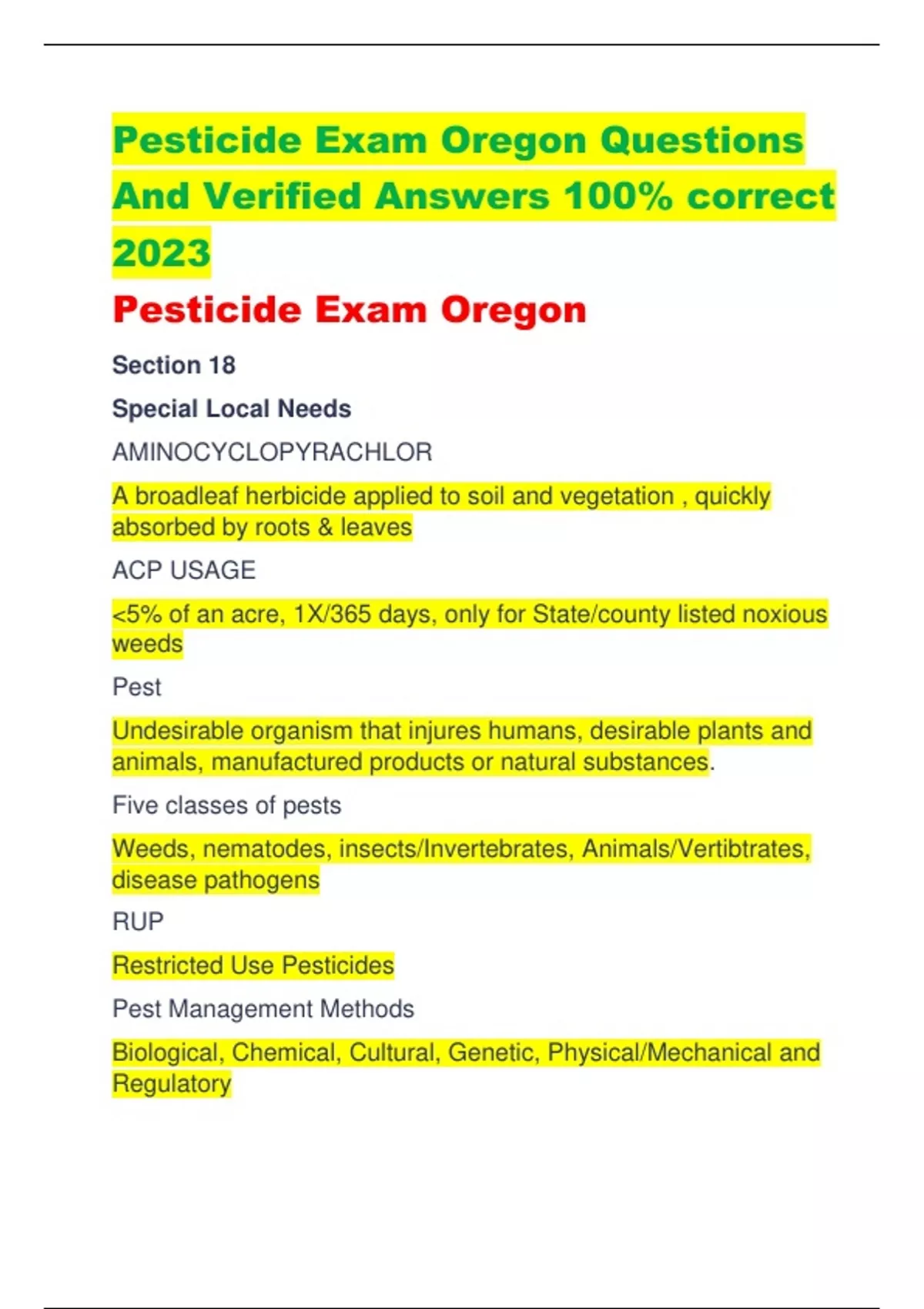 Pharmacology- NURS 251 Module Exam 6 portage Complete Set Questions & Answers | UPDATED Antibiotics drugs that have the ability to destroy or interfere with the development of bacteria Bacteria Resistance the ability of some bacteria to resist the actions of antibiotics. Bactericidal antibiotics that work by killing the bacteria Bacteriostatic antibiotics that do not actually kill bacteria, but only inhibit their growth. Empiric therapy the administration of antibiotics based on the practitioner’s judgment of pathogens most likely to be causing an apparent infection to avoid treatment delay before specific culture information has been obtained List the four general mechanism by which antibiotics generally work to rid the body of infection. 1. Interference with bacterial cell wall synthesis 2. Interference with protein synthesis 3. Interference with replication of DNA and RNA 4. Antimetabolite action that disrupts important metabolic reactions within the bacterial cell Gram-positive bacteria that stain purple on a gram stain. Gram-negative bacteria that stain pink on a gram stain. Aerobe bacterium that grows in the presence of air or requires oxygen for growth. Anaerobe bacterium that does not live or grow when oxygen is present. common Gram- positive bacteria staphylococcus aureus streptococcus pyogenes enterococcus faecalis common Gram-negative bacteria Pseudomonas aeruginosa Klebsiella pneumoniae Escherichia Coli Enterobacter species What does MRSA stand for? methicillin-resistance Staphylococcus aureus Examples of sulfonamides sulfamethoxazole-trimethoprim Examples of penicilli