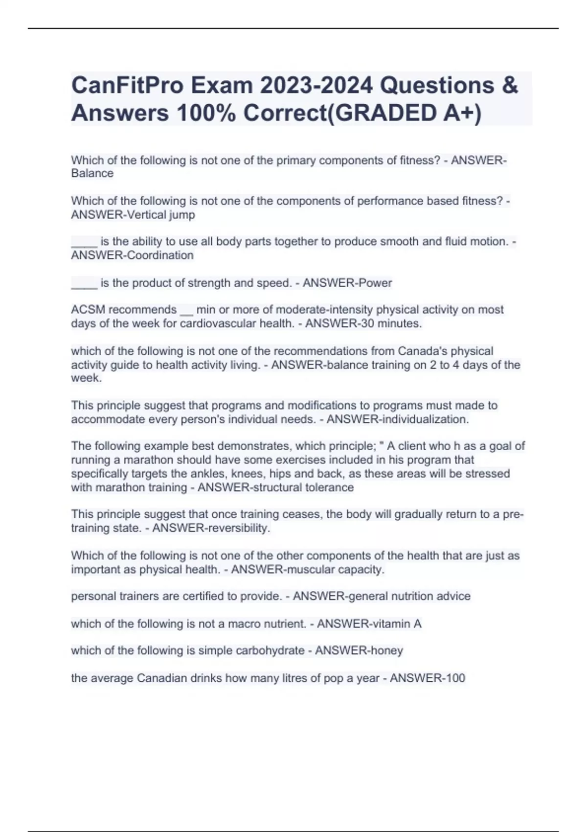 Which of the following is not one of the components of performance based fitness? - ANSWER-Vertical jump ____ is the ability to use all body parts together to produce smooth and fluid motion. - ANSWER-Coordination ____ is the product of strength and speed. - ANSWER-Power ACSM recommends __ min or more of moderate-intensity physical activity on most days of the week for cardiovascular health. - ANSWER-30 minutes. which of the following is not one of the recommendations from Canada's physical activity guide to health activity living. - ANSWER-balance training on 2 to 4 days of the week. This principle suggest that programs and modifications to programs must made to accommodate every person's individual needs. - ANSWER-individualization. The following example best demonstrates, which principle; " A client who h as a goal of running a marathon should have some exercises included in his program that specifically targets the ankles, knees, hips and back, as these areas will be stressed with marathon training - ANSWER-structural tolerance This principle suggest that once training ceases, the body will gradually return to a pre-training state. - ANSWER-reversibility. Which of the following is not one of the other components of the health that are just as important as physical health. - ANSWER-muscular capacity. personal trainers are certified to provide. - ANSWER-general nutrition advice which of the following is not a macro nutrient. - ANSWER-vitamin A