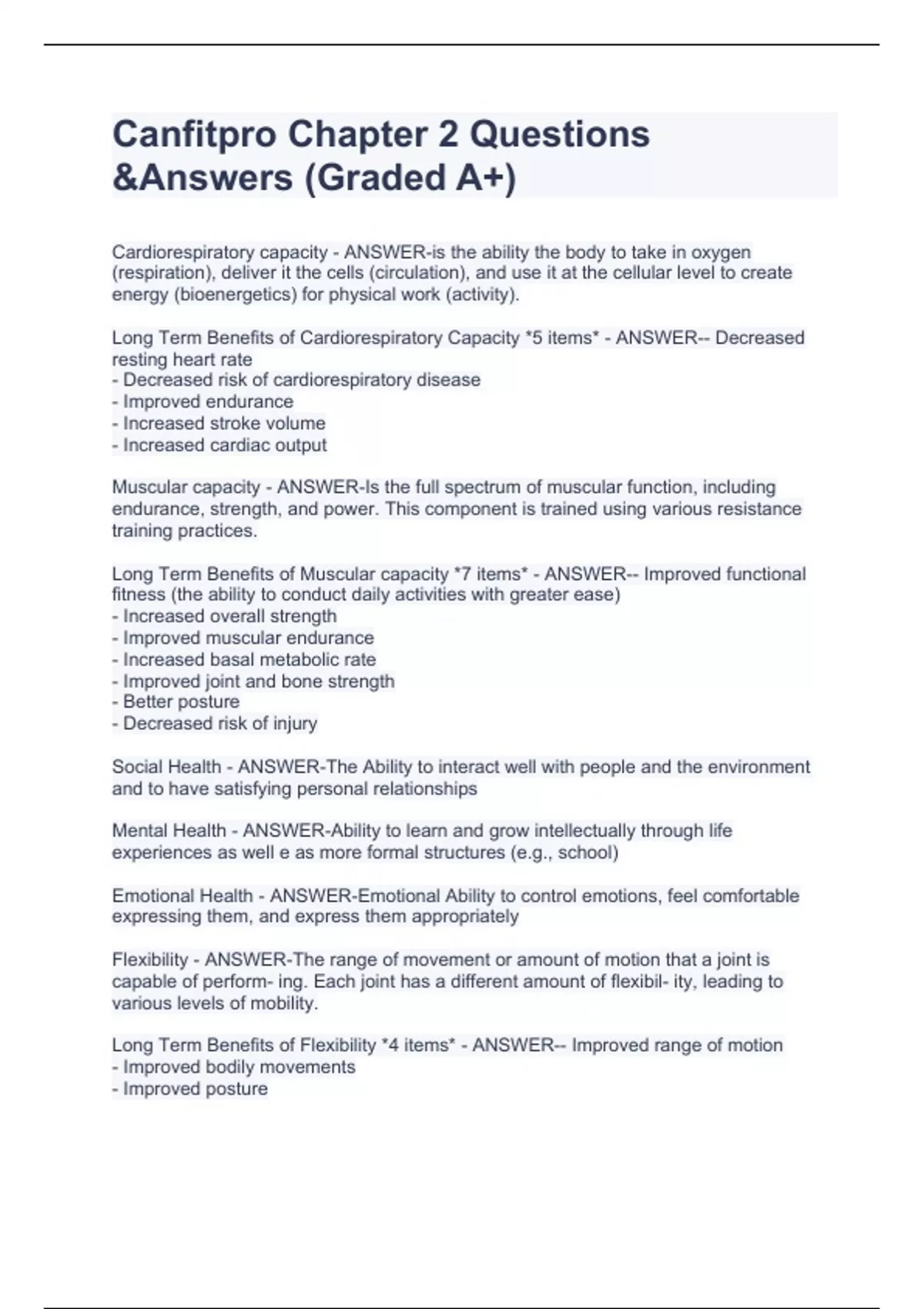Muscular capacity - ANSWER-Is the full spectrum of muscular function, including endurance, strength, and power. This component is trained using various resistance training practices. Long Term Benefits of Muscular capacity *7 items* - ANSWER-- Improved functional fitness (the ability to conduct daily activities with greater ease) - Increased overall strength - Improved muscular endurance - Increased basal metabolic rate - Improved joint and bone strength - Better posture - Decreased risk of injury Social Health - ANSWER-The Ability to interact well with people and the environment and to have satisfying personal relationships Mental Health - ANSWER-Ability to learn and grow intellectually through life experiences as well e as more formal structures (e.g., school) Emotional Health - ANSWER-Emotional Ability to control emotions, feel comfortable expressing them, and express them appropriately Flexibility - ANSWER-The range of movement or amount of motion that a joint is capable of perform- ing. Each joint has a different amount of flexibil- ity, leading to various levels of mobility. Long Term Benefits of Flexibility *4 items* - ANSWER-- Improved range of motion - Improved bodily movements - Improved posture