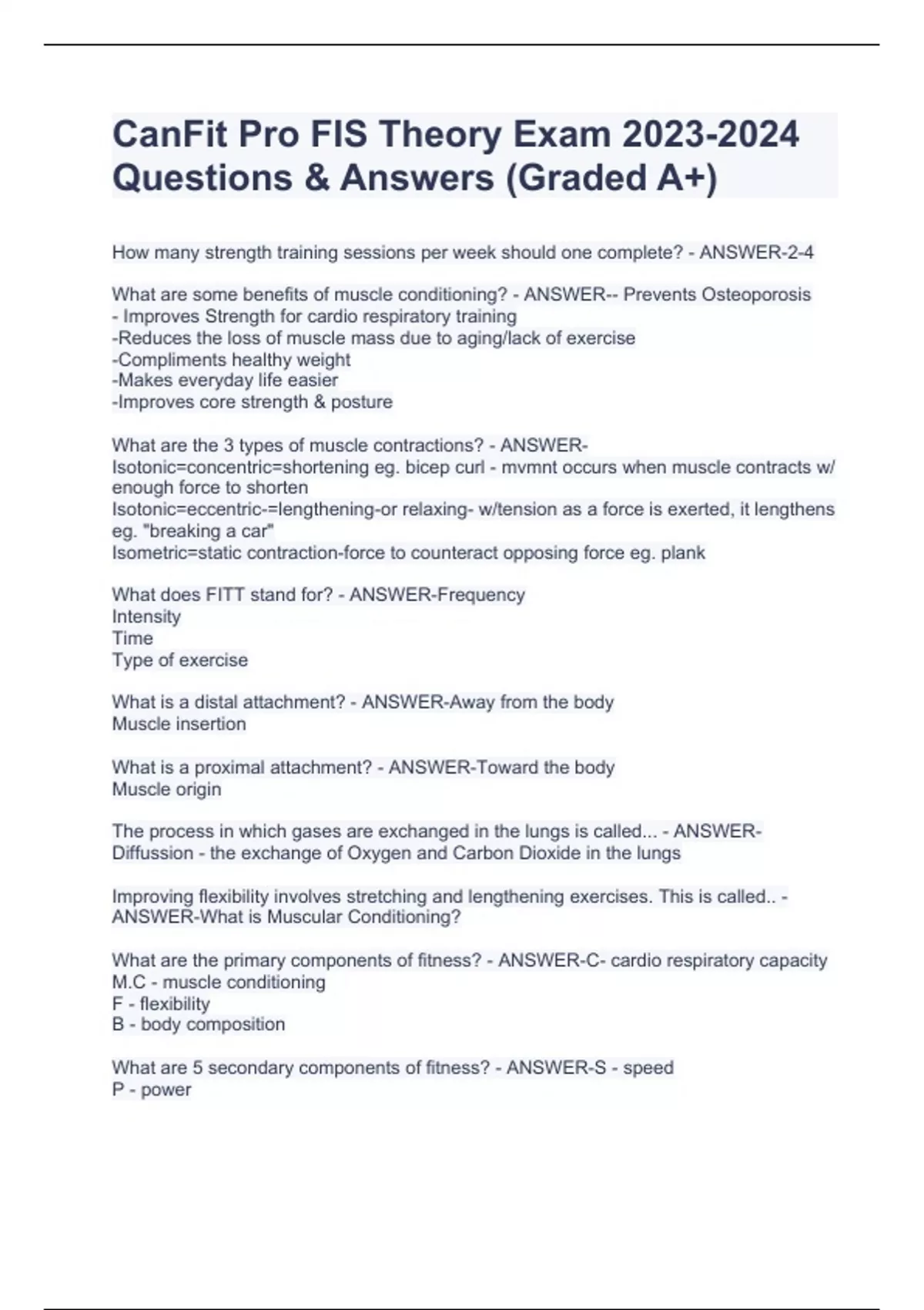 How many strength training sessions per week should one complete? - ANSWER-2-4 What are some benefits of muscle conditioning? - ANSWER-- Prevents Osteoporosis - Improves Strength for cardio respiratory training -Reduces the loss of muscle mass due to aging/lack of exercise -Compliments healthy weight -Makes everyday life easier -Improves core strength & posture What are the 3 types of muscle contractions? - ANSWER-Isotonic=concentric=shortening eg. bicep curl - mvmnt occurs when muscle contracts w/ enough force to shorten Isotonic=eccentric-=lengthening-or relaxing- w/tension as a force is exerted, it lengthens eg. "breaking a car" Isometric=static contraction-force to counteract opposing force eg. plank What does FITT stand for? - ANSWER-Frequency Intensity Time Type of exercise What is a distal attachment? - ANSWER-Away from the body Muscle insertion What is a proximal attachment? - ANSWER-Toward the body Muscle origin The process in which gases are exchanged in the lungs is called... - ANSWER-Diffussion - the exchange of Oxygen and Carbon Dioxide in the lungs Improving flexibility involves stretching and lengthening exercises. This is called.. - ANSWER-What is Muscular Conditioning?