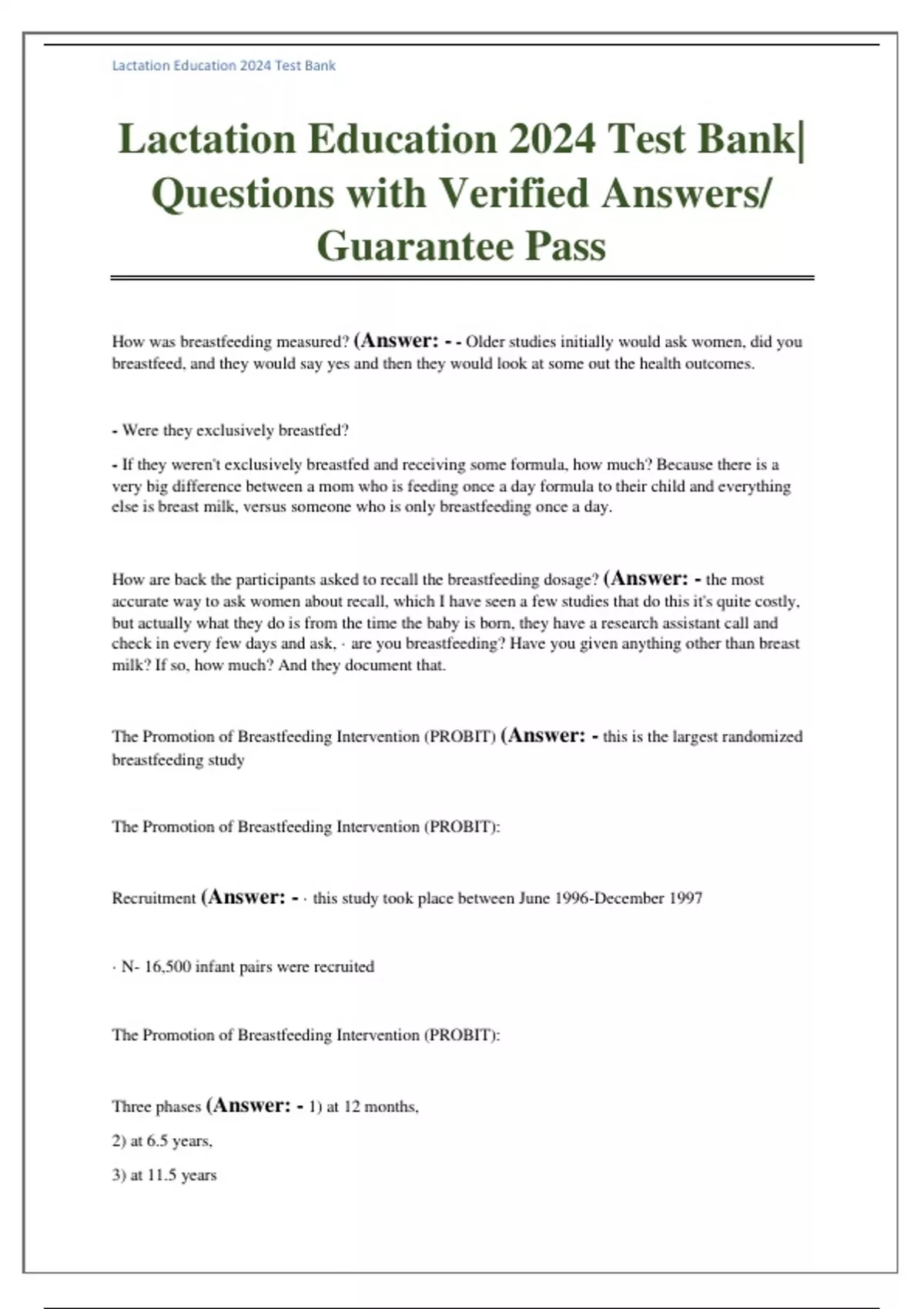 Lactation Education 2024 Test Bank| Questions with Verified Answers/ Guarantee Pass How was breastfeeding measured? (Answer: - ⁃ Older studies initially would ask women, did you breastfeed, and they would say yes and then they would look at some out the health outcomes. ⁃ Were they exclusively breastfed? ⁃ If they weren't exclusively breastfed and receiving some formula, how much? Because there is a very big difference between a mom who is feeding once a day formula to their child and everything else is breast milk, versus someone who is only breastfeeding once a day. How are back the participants asked to recall the breastfeeding dosage? (Answer: - the most accurate way to ask women about recall, which I have seen a few studies that do this it's quite costly, but actually what they do is from the time the baby is born, they have a research assistant call and check in every few days and ask, · are you breastfeeding? Have you given anything other than breast milk? If so, how much? And they document that. The Promotion of Breastfeeding Intervention (PROBIT) (Answer: - this is the largest randomized breastfeeding study The Promotion of Breastfeeding Intervention (PROBIT): Recruitment (Answer: - · this study took place between June 1996-December 1997 · N- 16,500 infant pairs were recruited The Promotion of Breastfeeding Intervention (PROBIT): Three phases (Answer: - 1) at 12 months, 2) at 6.5 years, 3) at 11.5 years The Promotion of Breastfeeding Intervention (PROBIT): What is the impact of low intake of Vitamin B12 on breastmilk? (Answer: - Since vitamin B12 crosses the placenta during pregnancy and is present in breast milk, exclusively breastfed infants of women who consume no animal products may have very limited reserves of vitamin B12, and possibly become deficient