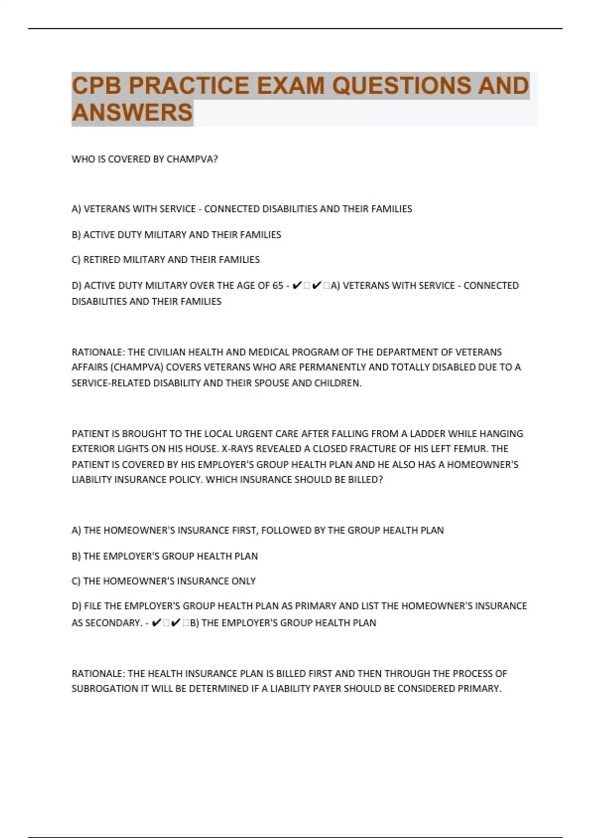 WHO IS COVERED BY CHAMPVA? A) VETERANS WITH SERVICE - CONNECTED DISABILITIES AND THEIR FAMILIES B) ACTIVE DUTY MILITARY AND THEIR FAMILIES C) RETIRED MILITARY AND THEIR FAMILIES D) ACTIVE DUTY MILITARY OVER THE AGE OF 65 - ️️A) VETERANS WITH SERVICE - CONNECTED DISABILITIES AND THEIR FAMILIES RATIONALE: THE CIVILIAN HEALTH AND MEDICAL PROGRAM OF THE DEPARTMENT OF VETERANS AFFAIRS (CHAMPVA) COVERS VETERANS WHO ARE PERMANENTLY AND TOTALLY DISABLED DUE TO A SERVICE-RELATED DISABILITY AND THEIR SPOUSE AND CHILDREN. PATIENT IS BROUGHT TO THE LOCAL URGENT CARE AFTER FALLING FROM A LADDER WHILE HANGING EXTERIOR LIGHTS ON HIS HOUSE. X-RAYS REVEALED A CLOSED FRACTURE OF HIS LEFT FEMUR. THE PATIENT IS COVERED BY HIS EMPLOYER'S GROUP HEALTH PLAN AND HE ALSO HAS A HOMEOWNER'S LIABILITY INSURANCE POLICY. WHICH INSURANCE SHOULD BE BILLED? A) THE HOMEOWNER'S INSURANCE FIRST, FOLLOWED BY THE GROUP HEALTH PLAN B) THE EMPLOYER'S GROUP HEALTH PLAN C) THE HOMEOWNER'S INSURANCE ONLY D) FILE THE EMPLOYER'S GROUP HEALTH PLAN AS PRIMARY AND LIST THE HOMEOWNER'S INSURANCE AS SECONDARY. - ️️B) THE EMPLOYER'S GROUP HEALTH PLAN RATIONALE: THE HEALTH INSURANCE PLAN IS BILLED FIRST AND THEN THROUGH THE PROCESS OF SUBROGATION IT WILL BE DETERMINED IF A LIABILITY PAYER SHOULD BE CONSIDERED PRIMARY.
