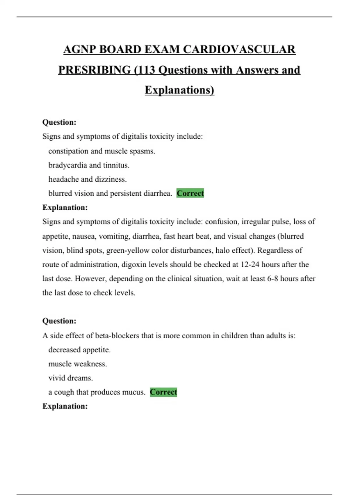 AGNP BOARD EXAM CARDIOVASCULAR PRESRIBING (113 Questions with Answers and Explanations) This document contains Well elaborated 113 questions and answers plus clear explanations to support each answer given on AGNP Board exam. The paper covers cardiovascular prescribing together with insightful explanation on terms. It extensively covers all important areas and is grade A+ certified.