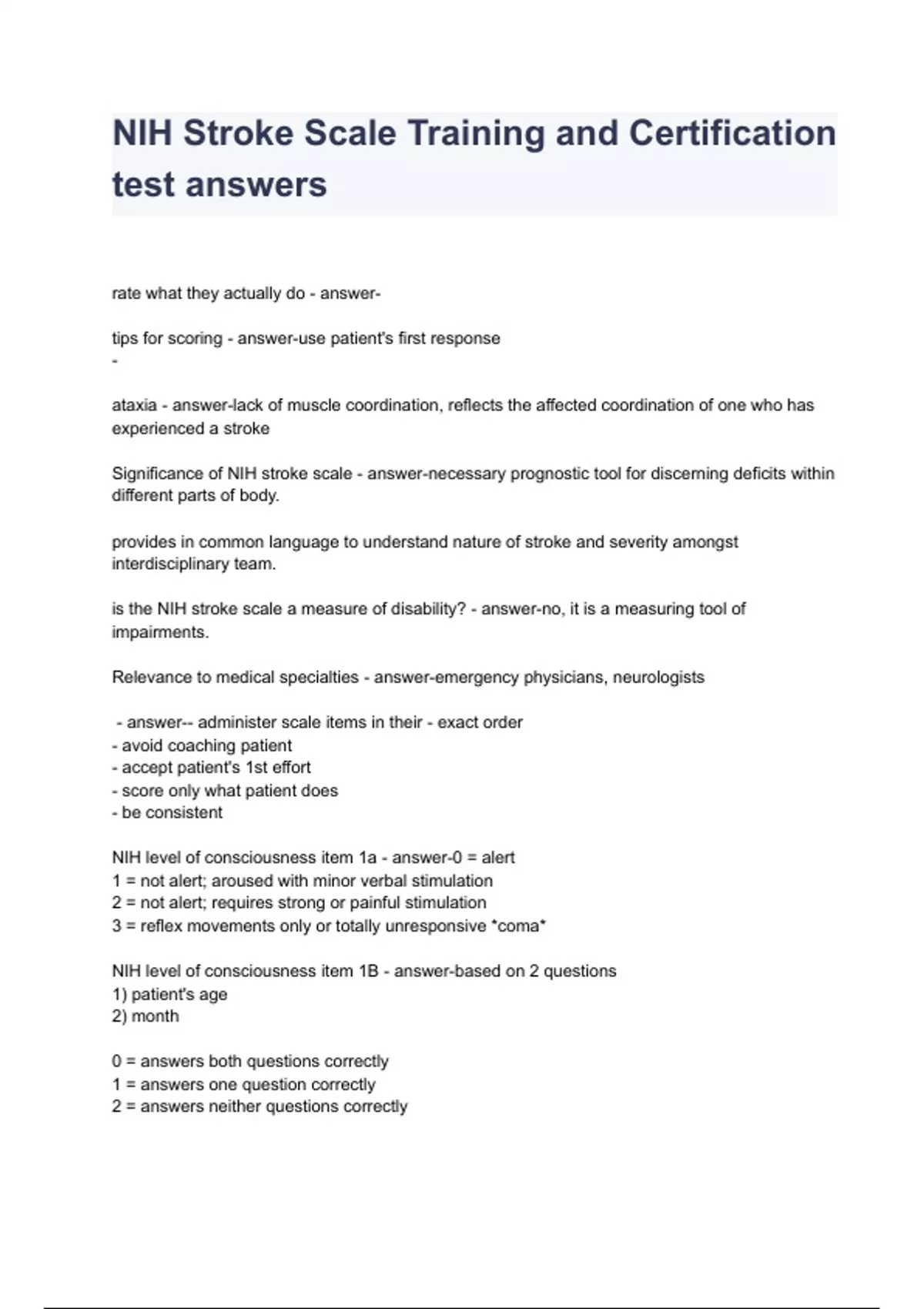 NIH Stroke Scale Training and Certification test answers