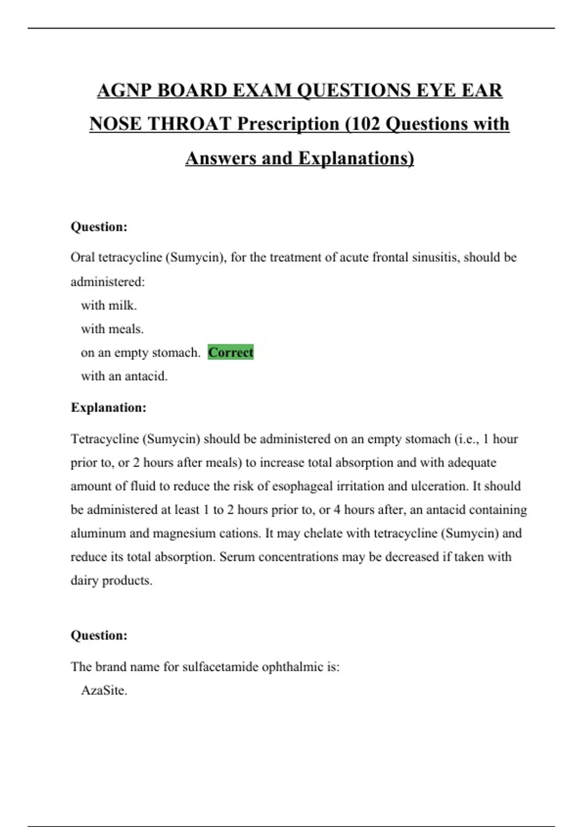AGNP BOARD EXAM QUESTIONS EYE EAR NOSE THROAT Prescription (102 Questions with Answers and Explanations) Well elaborated 107 questions and answers plus clear explanations to support each answer given on AGNP Board exam. The paper covers EYE, EAR, NOSE, THROAT Prescription together with insightful explanation and even more.