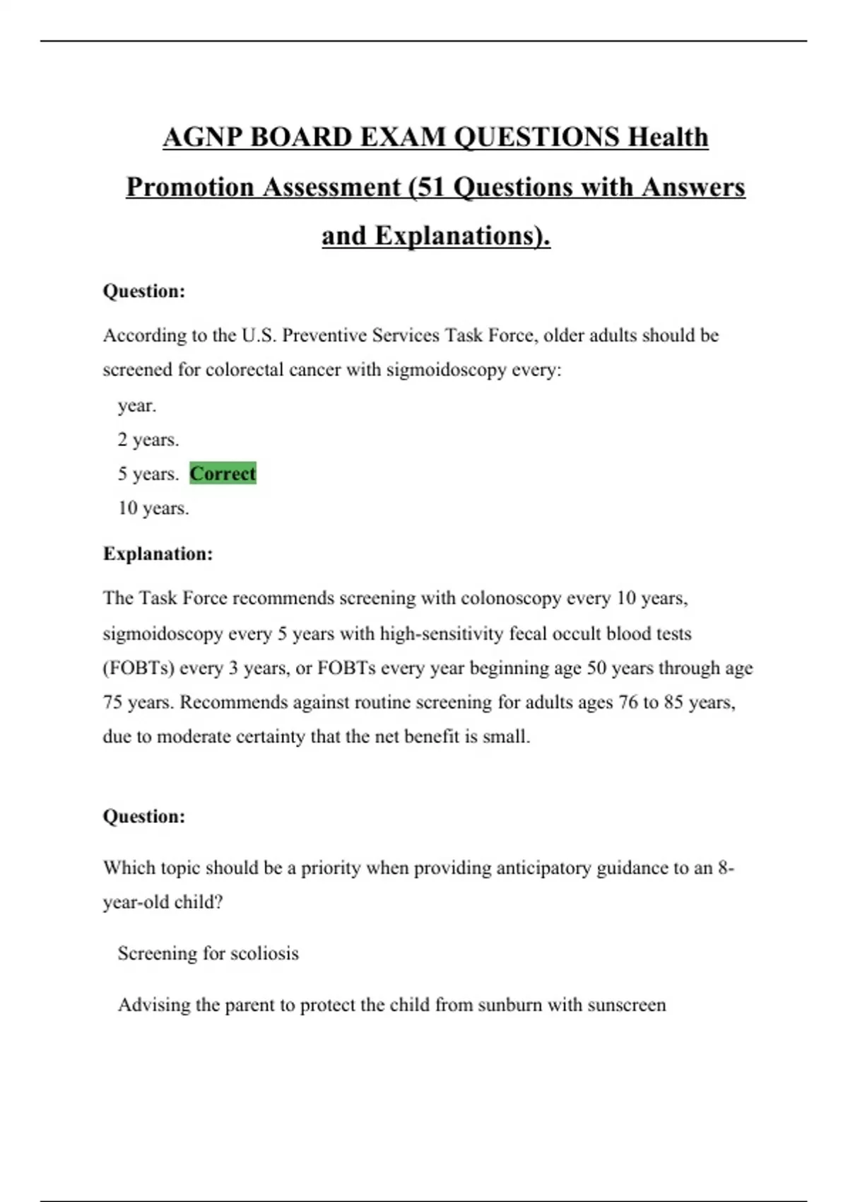 AGNP BOARD EXAM QUESTIONS Health Promotion Assessment (51 Questions with Answers and Explanations).