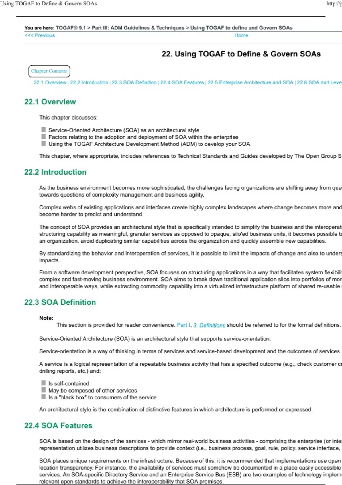 22.1 Overview This chapter discusses: Service-Oriented Architecture (SOA) as an architectural style Factors relating to the adoption and deployment of SOA within the enterprise Using the TOGAF Architecture Development Method (ADM) to develop your SOA This chapter, where appropriate, includes references to Technical Standards and Guides developed by The Open Group SOA Work Group. 22.2 Introduction As the business environment becomes more sophisticated, the challenges facing organizations are shifting away from questions of efficiency and automation towards questions of complexity management and business agility. Complex webs of existing applications and interfaces create highly complex landscapes where change becomes more and more difficult and the impacts of change become harder to predict and understand. The concept of SOA provides an architectural style that is specifically intended to simplify the business and the interoperation of different parts of that business. By structuring capability as meaningful, granular services as opposed to opaque, silo'ed business units, it becomes possible to quickly identify functional capabilities of an organization, avoid duplicating similar capabilities across the organization and quickly assemble new capabilities. By standardizing the behavior and interoperation of services, it is possible to limit the impacts of change and also to understand in advance the likely chain of impacts. From a software development perspective, SOA focuses on structuring applications in a way that facilitates system flexibility and agility - a necessity in today's complex and fast-moving business environment. SOA aims to break down traditional application silos into portfolios of more granular services that operate in open and interoperable ways, while extracting commodity capability into a virtualized infrastructure platform of shared re-usable utility services. 22.3 SOA Definition Note: This section is provided for reader convenience. Part I, should be referred to for the formal definitions. Service-Oriented Architecture (SOA) is an architectural style that supports service-orientation. Service-orientation is a way of thinking in terms of services and service-based development and the outcomes of services. A service is a logical representation of a repeatable business activity that has a specified outcome (e.g., check customer credit, provide weather data, consolidate drilling reports, etc.) and: Is self-contained May be composed of other services Is a "black box" to consumers of the service An architectural style is the combination of distinctive features in which architecture is performed or expressed. 22.4 SOA Features SOA is based on the design of the services - which mirror real-world business activities - comprising the enterprise (or inter-enterprise) business processes. Service representation utilizes business descriptions to provide context (i.e., business process, goal, rule, policy, service interface, service component, etc.). SOA places unique requirements on the infrastructure. Because of this, it is recommended that implementations use open standards to realize interoperability and location transparency. For instance, the availability of services must somehow be documented in a place easily accessible by those requiring the use of those services. An SOA-specific Directory Service and an Enterprise Service Bus (ESB) are two examples of technology implementations that require adherence to relevant open standards to achieve the interoperability that SOA promises. Implementations are enterprise environment-specific - they are constrained or enabled by context and must be described within that context. Given that, SOA requires strong governance of service representation and implementation. 22.5 Enterprise Architecture and SOA Enterprise architecture provides frameworks, tools, and techniques to assist organizations with the development and maintenance of their SOAs. Some of the key benefits that enterprise architecture provides include: Consistent abstractions of high-level strategies and deliverables to support planning and analysis Linkage of different perspectives to a single business problem (e.g., business, information systems, technology, breadth, depth, level of detail, etc.) providing a consistent model to address various domains and tests for completeness Identification of clear roadmaps to achieve future state Traceability that links IT and other assets to the business they support Support for impact assessment, risk/value analysis, and portfolio management Identified and documented principles, constraints, frameworks, patterns, and standards Governance frameworks and processes that ensure appropriate authority for decision-making Enterprise architecture becomes a foundation for service-orienting an organization, because it links stakeholders together, ensuring that the needs of each stakeholder community are met and that each stakeholder community is aware of appropriate context. This linkage is the foundation for interoperability and re-use. Through its linking of the business context to IT, enterprise architecture readily identifies and provides justification for the cost of change programs in relation to the business value to be derived from the effort. Enterprise architecture may provide the context and analysis capabilities to: Show how SOA solutions can be effectively architected to support business capabilities Show which services should be built and which should be re-us