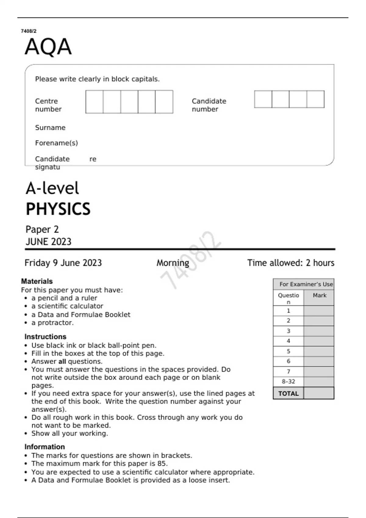 A-level PHYSICS Paper 2 JUNE 2023