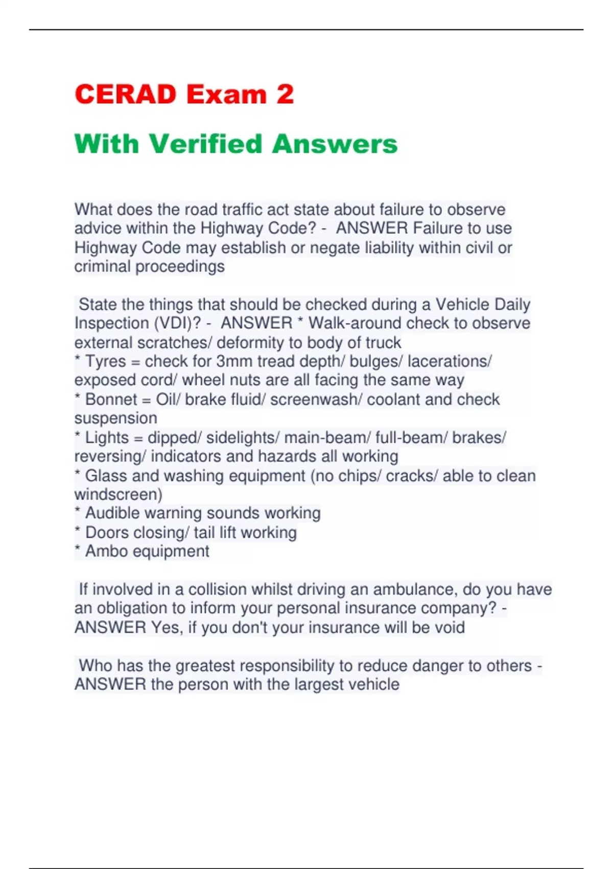 CERAD Exam 2 With Verified Answers What does the road traffic act state about failure to observe advice within the Highway Code? - ANSWER Failure to use Highway Code may establish or negate liability within civil or criminal proceedings State the things that should be checked during a Vehicle Daily Inspection (VDI)? - ANSWER * Walk-around check to observe external scratches/ deformity to body of truck * Tyres = check for 3mm tread depth/ bulges/ lacerations/ exposed cord/ wheel nuts are all facing the same way * Bonnet = Oil/ brake fluid/ screenwash/ coolant and check suspension * Lights = dipped/ sidelights/ main-beam/ full-beam/ brakes/ reversing/ indicators and hazards all working * Glass and washing equipment (no chips/ cracks/ able to clean windscreen) * Audible warning sounds working * Doors closing/ tail lift working * Ambo equipment If involved in a collision whilst driving an ambulance, do you have an obligation to inform your personal insurance company? - ANSWER Yes, if you don't your insurance will be void Who has the greatest responsibility to reduce danger to others - ANSWER the person with the largest vehicle Highway Code rule 89 states that your vehicle must comply with requirements of the Road Vehicles (Construction and Use) Regulations and what else? - ANSWER Road Vehicles Lighting Regulations What is the definition of a road? - ANSWER Any highway/ road to which the public has access and includes bridges over which a road passes Who is responsible for setting penalties for road traffic offences? - ANSWER Parliament (The courts then serve the penalties) Failure to rectify vehicle defects can result in penalty points on a driving license, True or False? - ANSWER True Driving standards required by law as per road traffic act 1998... What are they? - ANSWER If a person drives a mechanically propelled vehicle without due care/ lack of consideration for other people, he is guilty of offence Those found guilty of death by dangerous driving will be given a custodial sentence no matter the mitigating factors, true or false? - ANSWER True How many penalty points can a driver accumulate within a 3 year period before they get disqualified from dangerous driving? - ANSWER 12 points What's the correct order fro a pre-driver check? - ANSWER 1. Handbrake and gear 2. Seat adjustment and steering wheel 3. Mirrors 4. Perform starting procedure How many penalty points can be given for each vehicle defect identified - ANSWER 3 per defect It's not a statutory obligation for all ambulance staff to drive in accordance with current road traffic legislation... True or false? - ANSWER False, it is a statutory obligation Ambulance staff who drive have a responsibility to maintain their knowledge of the Highway Code... True or false? - ANSWER True Describe a positive instruction sign - ANSWER sign with blue circle and no red border Describe a non-primary route sign - ANSWER Whit sign black border