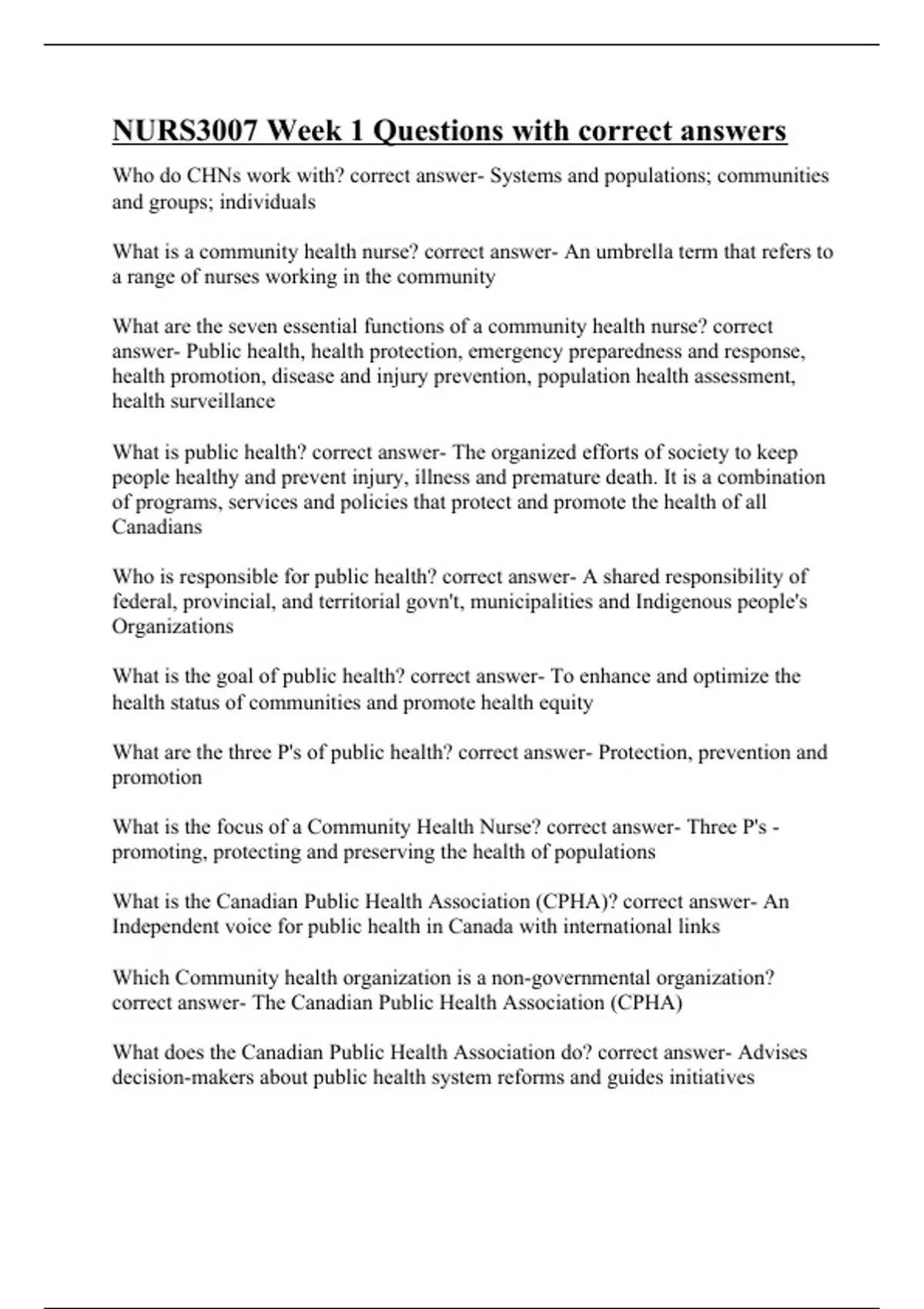Who do CHNs work with? correct answer- Systems and populations; communities and groups; individuals What is a community health nurse? correct answer- An umbrella term that refers to a range of nurses working in the community What are the seven essential functions of a community health nurse? correct answer- Public health, health protection, emergency preparedness and response, health promotion, disease and injury prevention, population health assessment, health surveillance What is public health? correct answer- The organized efforts of society to keep people healthy and prevent injury, illness and premature death. It is a combination of programs, services and policies that protect and promote the health of all Canadians Who is responsible for public health? correct answer- A shared responsibility of federal, provincial, and territorial govn't, municipalities and Indigenous people's Organizations What is the goal of public health? correct answer- To enhance and optimize the health status of communities and promote health equity What are the three P's of public health? correct answer- Protection, prevention and promotion What is the focus of a Community Health Nurse? correct answer- Three P's - promoting, protecting and preserving the health of populations What is the Canadian Public Health Association (CPHA)? correct answer- An Independent voice for public health in Canada with international links Which Community health organization is a non-governmental organization? correct answer- The Canadian Public Health Association (CPHA) What does the Canadian Public Health Association do? correct answer- Advises decision-makers about public health sy