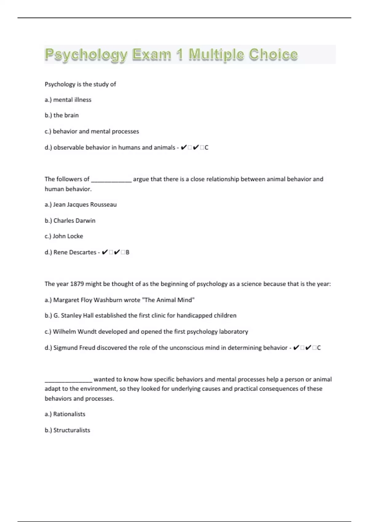 Psychology is the study of a.) mental illness b.) the brain c.) behavior and mental processes d.) observable behavior in humans and animals - ️️C The followers of ____________ argue that there is a close relationship between animal behavior and human behavior. a.) Jean Jacques Rousseau b.) Charles Darwin c.) John Locke d.) Rene Descartes - ️️B The year 1879 might be thought of as the beginning of psychology as a science because that is the year: a.) Margaret Floy Washburn wrote "The Animal Mind" b.) G. Stanley Hall established the first clinic for handicapped children c.) Wilhelm Wundt developed and opened the first psychology laboratory d.) Sigmund Freud discovered the role of the unconscious mind in determining behavior - ️️C ______________ wanted to know how specific behaviors and mental processes help a person or animal adapt to the environment, so they looked for underlying causes and practical consequences of these behaviors and processes. a.) Rationalists b.) Structuralists