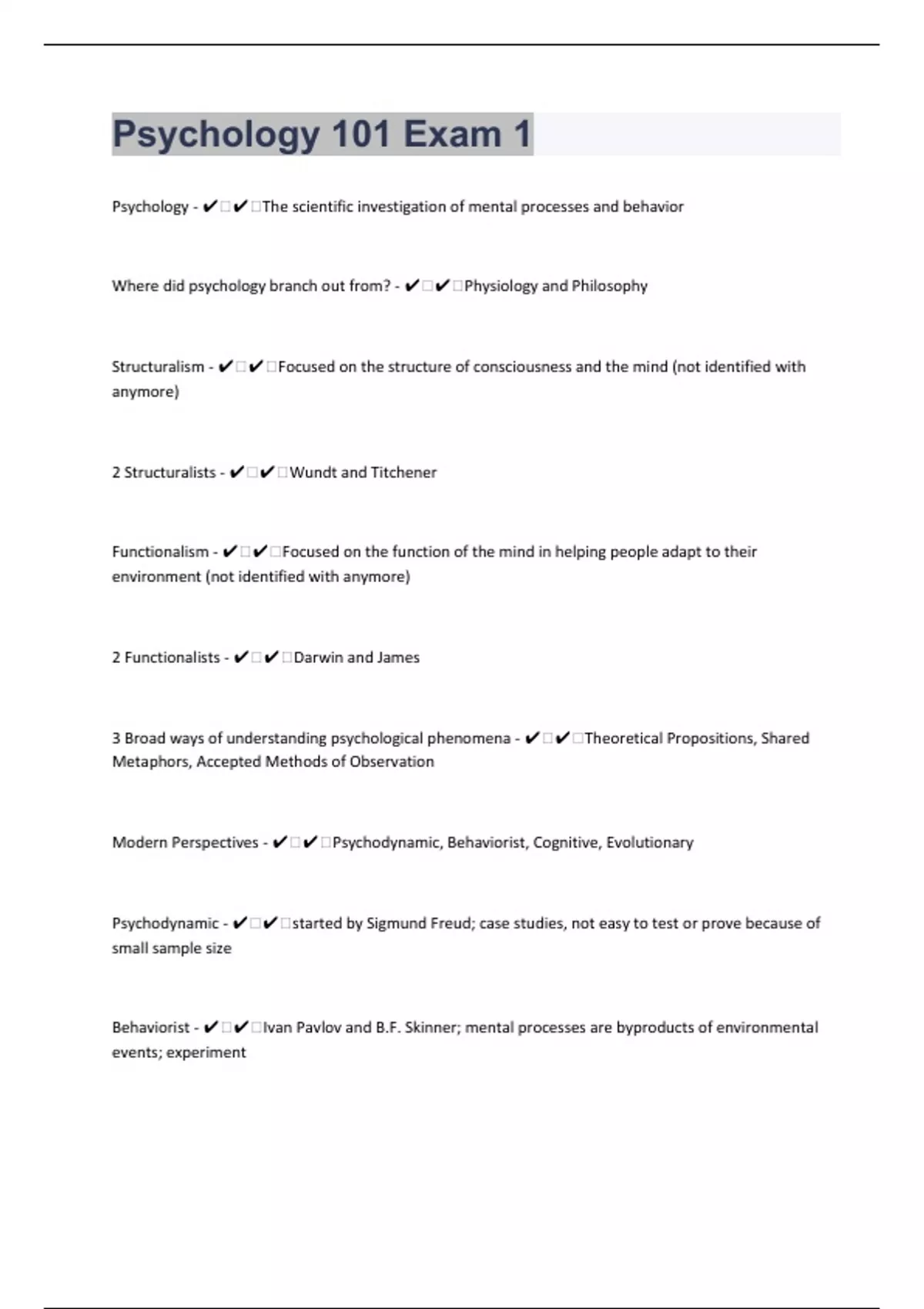 Psychology - ️️The scientific investigation of mental processes and behavior Where did psychology branch out from? - ️️Physiology and Philosophy Structuralism - ️️Focused on the structure of consciousness and the mind (not identified with anymore) 2 Structuralists - ️️Wundt and Titchener Functionalism - ️️Focused on the function of the mind in helping people adapt to their environment (not identified with anymore) 2 Functionalists - ️️Darwin and James 3 Broad ways of understanding psychological phenomena - ️️Theoretical Propositions, Shared Metaphors, Accepted Methods of Observation Modern Perspectives - ️️Psychodynamic, Behaviorist, Cognitive, Evolutionary Psychodynamic - ️️started by Sigmund Freud; case studies, not easy to test or prove because of small sample size Behaviorist - ️️Ivan Pavlov and B.F. Skinner; mental processes are byproducts of environmental events; experiment Behaviorist Metaphor - ️️People are like machines