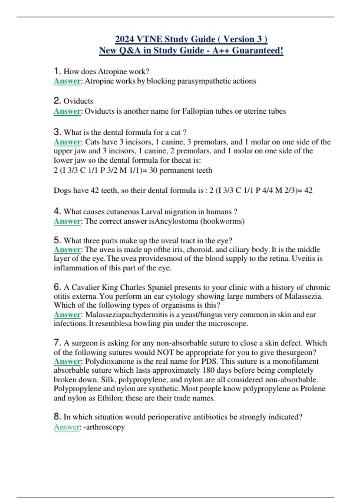 2024 VTNE Study Guide ( Version 3 ) New Q&A in Study Guide - A++ Guaranteed! 1. How does Atropine work? Answer: Atropine works by blocking parasympathetic actions 2. Oviducts Answer: Oviducts is another name for Fallopian tubes or uterine tubes 3. What is the dental formula for a cat ? Answer: Cats have 3 incisors, 1 canine, 3 premolars, and 1 molar on one side of the upper jaw and 3 incisors, 1 canine, 2 premolars, and 1 molar on one side of the lower jaw so the dental formula for thecat is: 2 (I 3/3 C 1/1 P 3/2 M 1/1)= 30 permanent teeth Dogs have 42 teeth, so their dental formula is : 2 (I 3/3 C 1/1 P 4/4 M 2/3)= 42 4. What causes cutaneous Larval migration in humans ? Answer: The correct answer isAncylostoma (hookworms) 5. What three parts make up the uveal tract in the eye? Answer: The uvea is made up ofthe iris, choroid, and ciliary body.It is the middle layer of the eye.The uvea providesmost of the blood supply to the retina. Uveitis is inflammation of this part of the eye. 6. A Cavalier King Charles Spaniel presents to your clinic with a history of chronic otitis externa.You perform an ear cytology showing large numbers of Malassezia. Which of the following types of organisms is this? Answer: Malasseziapachydermitisis a yeast/fungus very common in skin and ear infections.It resemblesa bowling pin under the microscope. 7. A surgeon is asking for any non-absorbable suture to close a skin defect. Which of the following sutures would NOT be appropriate for you to give thesurgeon? Answer: Polydioxanone is the real name for PDS. This suture is a monofilament absorbable suture which lasts approximately 180 days before being completely broken down. Silk, polypropylene, and nylon are all considered non-absorbable. Polypropylene and nylon are synthetic.Most people know polypropylene as Prolene and nylon as Ethilon; these are their trade names. 8. In which situation would perioperative antibiotics be strongly indicated? Answer: -arthroscopy