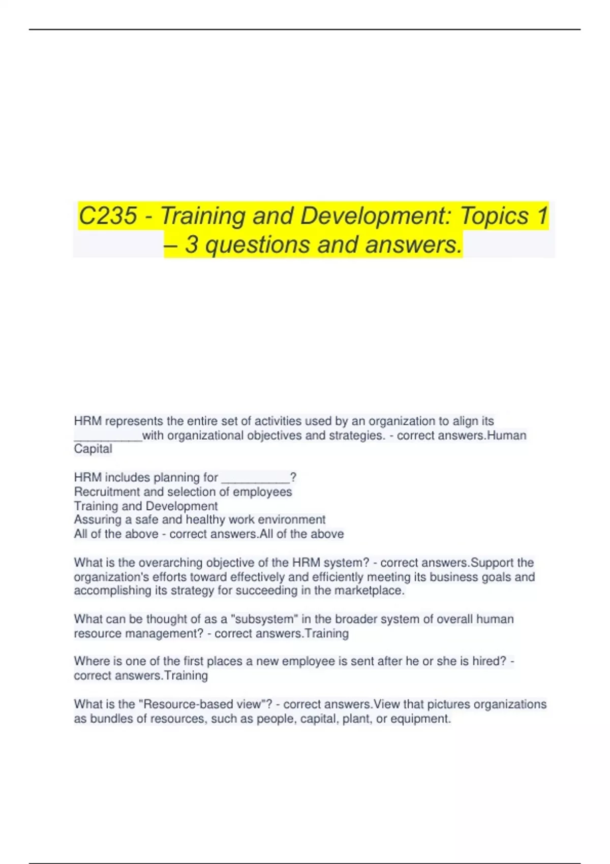 C235 - Training and Development: Topics 1 – 3 questions and answers. HRM represents the entire set of activities used by an organization to align its __________with organizational objectives and strategies. - correct answers.Human Capital HRM includes planning for __________? Recruitment and selection of employees Training and Development Assuring a safe and healthy work environment All of the above - correct answers.All of the above What is the overarching objective of the HRM system? - correct answers.Support the organization's efforts toward effectively and efficiently meeting its business goals and accomplishing its strategy for succeeding in the marketplace. What can be thought of as a "subsystem" in the broader system of overall human resource management? - correct answers.Training Where is one of the first places a new employee is sent after he or she is hired? - correct answers.Training What is the "Resource-based view"? - correct answers.View that pictures organizations as bundles of resources, such as people, capital, plant, or equipment. In the resource-based view of the firm, resources are considered potential sources of __________ in the marketplace. - correct answers.Competitive advantage According to RBV, when can a resource create a competitive advantage? - correct answers.Only when it is not available to other firms and when it cannot easily move across organizational boundaries. The four characteristics a resource must possess before it is capable of providing a firm with a sustained competitive advantage are: - correct answers.Create value for the customer, be rare and/or unique, be non-substitutable, and be inimitable. Human resources works best when combined in ________ and _________ ways. - correct answers.Creative and Productive Training is used by an organization in order to: - correct answers.Facilitate goal accomplishment True or False: The Association for Talent Development (ATD) publishes an annual report on the state of the training industry in which it refers to the state of L&D (learning and development). - correct answers.True Training may be aimed at one or more of the following three goals: Improve individual self-awareness Enhance knowledge and skill levels in one or more areas of expertise Increase the motivation to do the job well All of the above - correct answers.All of the above Before any training and development program is begun, you should first: - correct answers.Assess the training needs Organizations often skip a vital step in their training and development programs which is to: - correct answers.Evaluate the effectiveness of training In the public-sector, training and development programs seem to be: - correct answers.Increasing True or False: In the late 1970s, the average annual training expenditure per employee was under $100. - correct answers.True As of 2011, the most common types of training were: I: Managerial and supervisory training II: Profession or industry specific training III: Training on business practices - correct answers.I, II and III