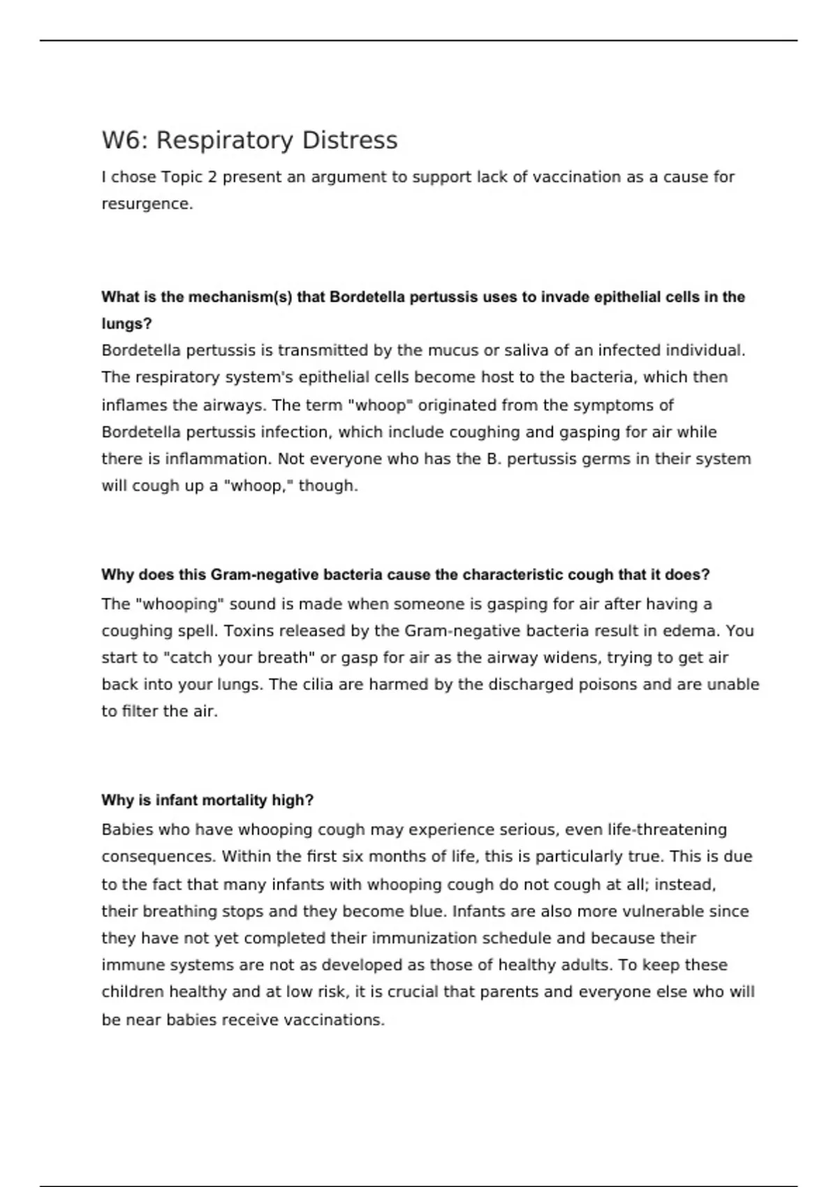 W6:RespiratoryDistress IchoseTopic2presentanargumenttosupportlackofvaccinationasacauseforresurgence. Whatisthemechanism(s)thatBordetellapertussisusestoinvadeepithelialcellsinthelungs? WhydoesthisGram-negativebacteriacausethecharacteristiccoughthatitdoes? Whyisinfantmortalityhigh? WhatroledoesherdimmunityplayinthespreadofaninfectiousdiseaselikeWhoopingcough?
