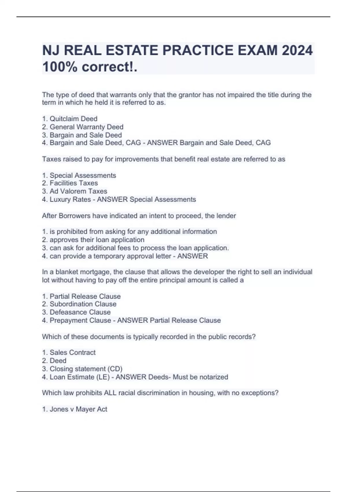 NJ REAL ESTATE PRACTICE EXAM 2024 100% correct!. Taxes raised to pay for improvements that benefit real estate are referred to as 1. Special Assessments 2. Facilities Taxes 3. Ad Valorem Taxes 4. Luxury Rates - ANSWER Special Assessments The type of deed that warrants only that the grantor has not impaired the title during the term in which he held it is referred to as. 1. Quitclaim Deed 2. General Warranty Deed 3. Bargain and Sale Deed 4. Bargain and Sale Deed, CAG - ANSWER Bargain and Sale Deed, CAG Taxes raised to pay for improvements that benefit real estate are referred to as 1. Special Assessments 2. Facilities Taxes 3. Ad Valorem Taxes 4. Luxury Rates - ANSWER Special Assessments After Borrowers have indicated an intent to proceed, the lender 1. is prohibited from asking for any additional information 2. approves their loan application 3. can ask for additional fees to process the loan application. 4. can provide a temporary approval letter - ANSWER In a blanket mortgage, the clause that allows the developer the right to sell an individual lot without having to pay off the entire principal amount is called a 1. Partial Release Clause 2. Subordination Clause 3. Defeasance Clause 4. Prepayment Clause - ANSWER Partial Release Clause Which of these documents is typically recorded in the public records? 1. Sales Contract 2. Deed 3. Closing statement (CD) 4. Loan Estimate (LE) - ANSWER Deeds- Must be notarized Which law prohibits ALL racial discrimination in housing, with no exceptions? 1. Jones v Mayer Act 2. F