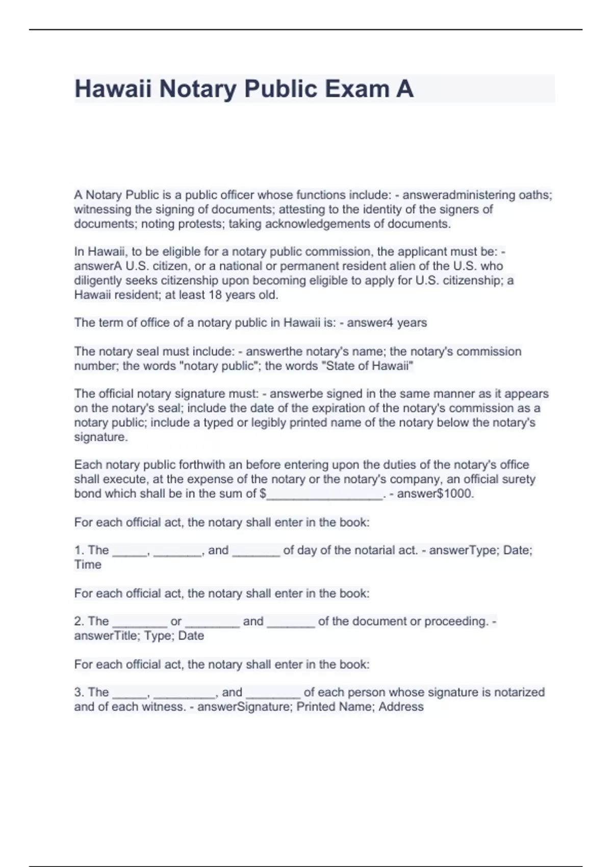 Hawaii Notary Public Exam A
