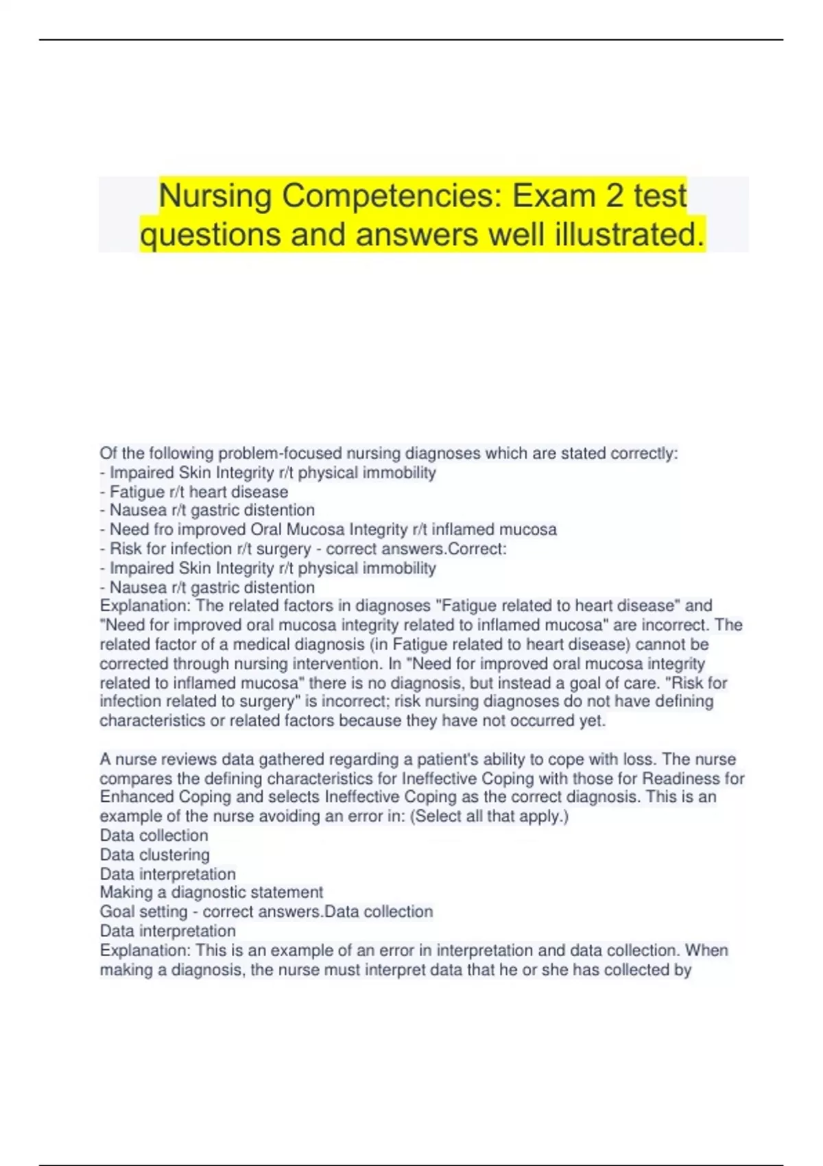 Nursing Competencies: Exam 2 test questions and answers well illustrated. Of the following problem-focused nursing diagnoses which are stated correctly: - Impaired Skin Integrity r/t physical immobility - Fatigue r/t heart disease - Nausea r/t gastric distention - Need fro improved Oral Mucosa Integrity r/t inflamed mucosa - Risk for infection r/t surgery - correct answers.Correct: - Impaired Skin Integrity r/t physical immobility - Nausea r/t gastric distention Explanation: The related factors in diagnoses "Fatigue related to heart disease" and "Need for improved oral mucosa integrity related to inflamed mucosa" are incorrect. The related factor of a medical diagnosis (in Fatigue related to heart disease) cannot be corrected through nursing intervention. In "Need for improved oral mucosa integrity related to inflamed mucosa" there is no diagnosis, but instead a goal of care. "Risk for infection related to surgery" is incorrect; risk nursing diagnoses do not have defining characteristics or related factors because they have not occurred yet. A nurse reviews data gathered regarding a patient's ability to cope with loss. The nurse compares the defining characteristics for Ineffective Coping with those for Readiness for Enhanced Coping and selects Ineffective Coping as the correct diagnosis. This is an example of the nurse avoiding an error in: (Select all that apply.) Data collection Data clustering Data interpretation Making a diagnostic statement Goal setting - correct answers.Data collection Data interpretation Explanation: This is an example of an error in interpretation and data collection. When making a diagnosis, the nurse must interpret data that he or she has collected by identifying and organizing relevant assessment patterns to support the presence of patient problems. In the case of the two diagnoses in this question, there can be conflicting cues. The nurse must obtain more information and recognize the cues that point to the correct diagnosis. The use of standard formal nursing diagnostic statements serves several purposes in nursing practice, including which of the following? (Select all that apply.) -Defines a patient's problem, giving members of the health care team a common language for understanding the patient's needs - Allows physicians and allied health staff to communicate with nurses how they provide care among themselves -Helps nurses focus on the scope of nursing practice -Creates practice guidelines for collaborative health care activities -Builds and expands nursing knowledge - correct answers.Correct: Defines a patient's problem, giving members of the health care team a common language for understanding the patient's needs Helps nurses focus on the scope of nursing practice Builds and expands nursing knowledge knowledge base - correct answers.NOT experience or policy and procedure manuals IS reading current evidence from literature holistic vie of patient needs application of nursing theory making decisions about a group of patients: - correct ne activities to resolve more than one patient problem consider use of assistive personnel analyze diagnoses/problems and decide which are most urgent based on patient needs What separates RNs from technicians? - correct cal decision making: making decisions on the basis of clinical information What involves open-mindedness, continual inquiry, and perseverance, combined with a willingness to look at each unique patient situation and determine which identified assumptions are true and relevant? - correct answers.Critical thinking The use of ______ ______ ______ makes you an informed critical thinker. - correct nce based knowledge Why is the care provided by a nurse who applies critical thinking better than the care provided by a nurse that doesn't? - correct answers.The nurse is better able to (1) anticipate the patient's needs, (2) identify comfort problems, and (3) offer appropriate care No critical thinking = carelessly formed quick solutions What are concepts for a critical thinker? - correct seekiing