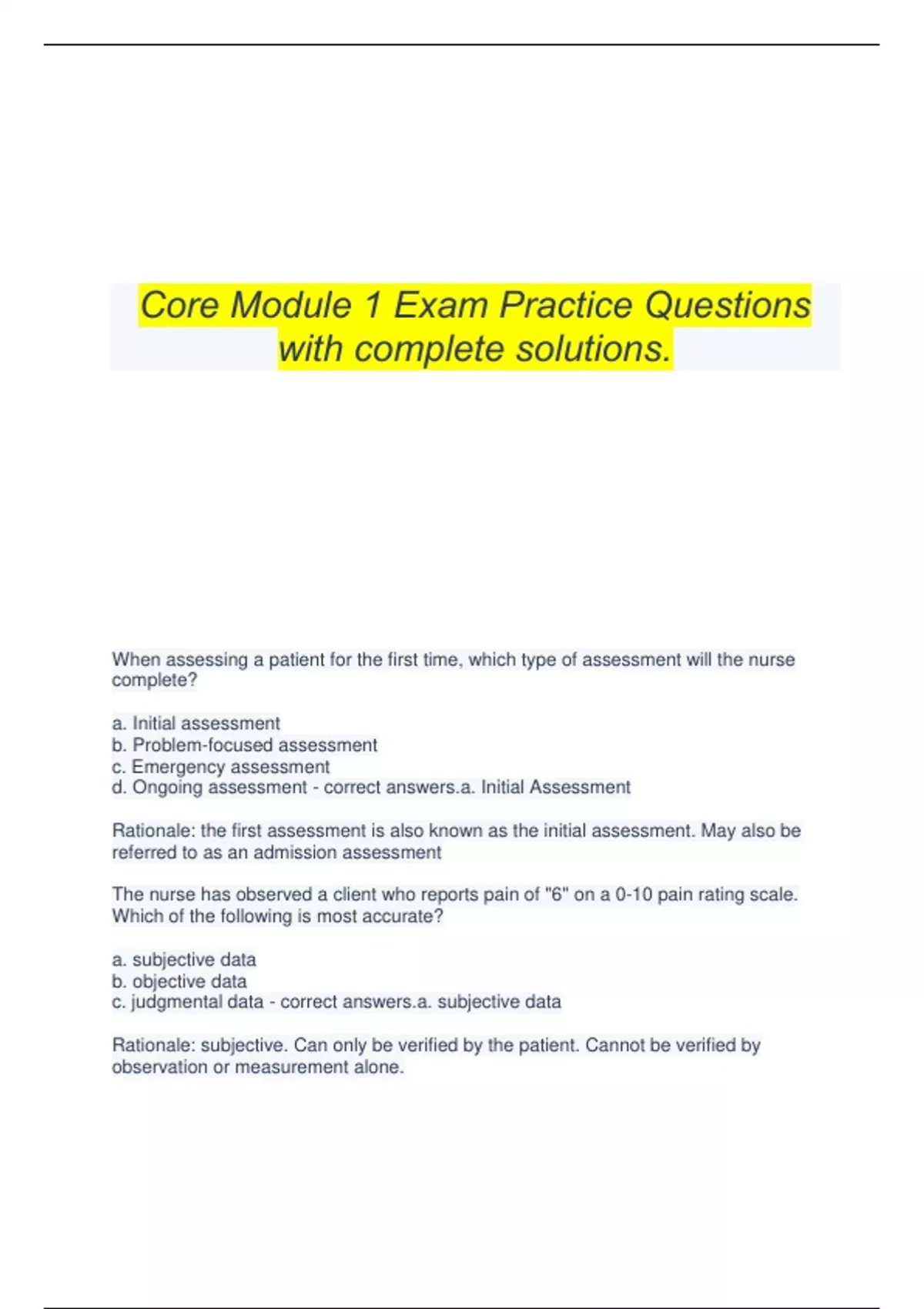 Core Module 1 Exam Practice Questions with complete solutions. When assessing a patient for the first time, which type of assessment will the nurse complete? a. Initial assessment b. Problem-focused assessment c. Emergency assessment d. Ongoing assessment - correct answers.a. Initial Assessment Rationale: the first assessment is also known as the initial assessment. May also be referred to as an admission assessment The nurse has observed a client who reports pain of "6" on a 0-10 pain rating scale. Which of the following is most accurate? a. subjective data b. objective data c. judgmental data - correct answers.a. subjective data Rationale: subjective. Can only be verified by the patient. Cannot be verified by observation or measurement alone. The Electronic Health Record (EHR) is an example of which of the following? a. A database of patient information b. A public record c. A record that can be deleted d. A record never to be seen by the patient - correct answers.a. A database of patient information Rationale: the patient record is a database of patient information, is not public record, cannot be deleted and can be seen by the patient An elderly patient who is unable to communicate is being admitted. Which of the following is/are appropriate sources of Protected Health Information? SELECT ALL THAT APPLY a. Family members b. Healthcare professionals c. A non-family neighbor d. Old client records e. Literature - correct answers.a. Family members b. Healthcare professionals d. Old client records e. Literature Rationale: family members, healthcare professionals, old records and literature can be used to gather information considered protected health information. Neighbors who simply want to gain access to private health information are not appropriate sources of information unless provided in a power of attorney. When the nurse is assessing a patient for skin temperature, which of the following is the best technique? a. Inspection b. Palpation c. Auscultation d. Percussion - correct answers.b. Palpation Rationale: using touch to determine texture, temperature, vibration, position, distension, pulsation and presence of pain on palpation is done using palpation When assessing a patient, the nurse states, "Tell me more about your home life." Which type of therapeutic communication does this exemplify? a. Closed question b. Neutral question c. Leading question d. Open-ended question - correct answers.d. Open-ended question