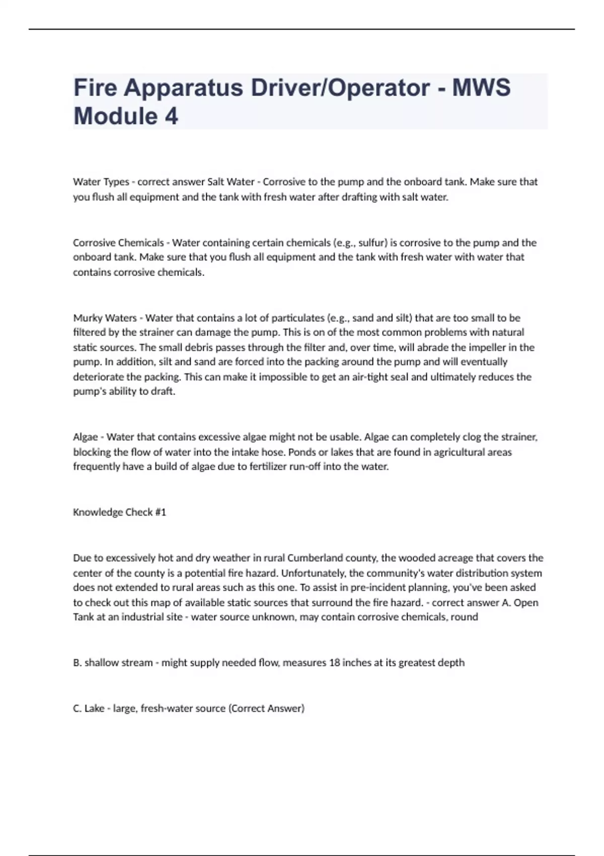 Fire Apparatus Driver Operator - MWS Module 4 Question and answers 100% correct 2023/2024Water Types - correct answer Salt Water - Corrosive to the pump and the onboard tank. Make sure that you flush all equipment and the tank with fresh water after drafting with salt water. Corrosive Chemicals - Water containing certain chemicals (e.g., sulfur) is corrosive to the pump and the onboard tank. Make sure that you flush all equipment and the tank with fresh water with water that contains corrosive chemicals. Murky Waters - Water that contains a lot of particulates (e.g., sand and silt) that are too small to be filtered by the strainer can damage the pump. This is on of the most common problems with natural static sources. The small debris passes through the filter and, over time, will abrade the impeller in the pump. In additio
