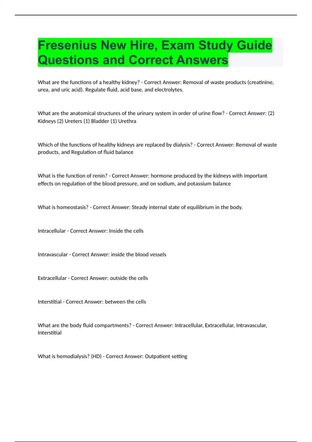 Fresenius New Hire, Exam Study Guide Questions and Correct Answers