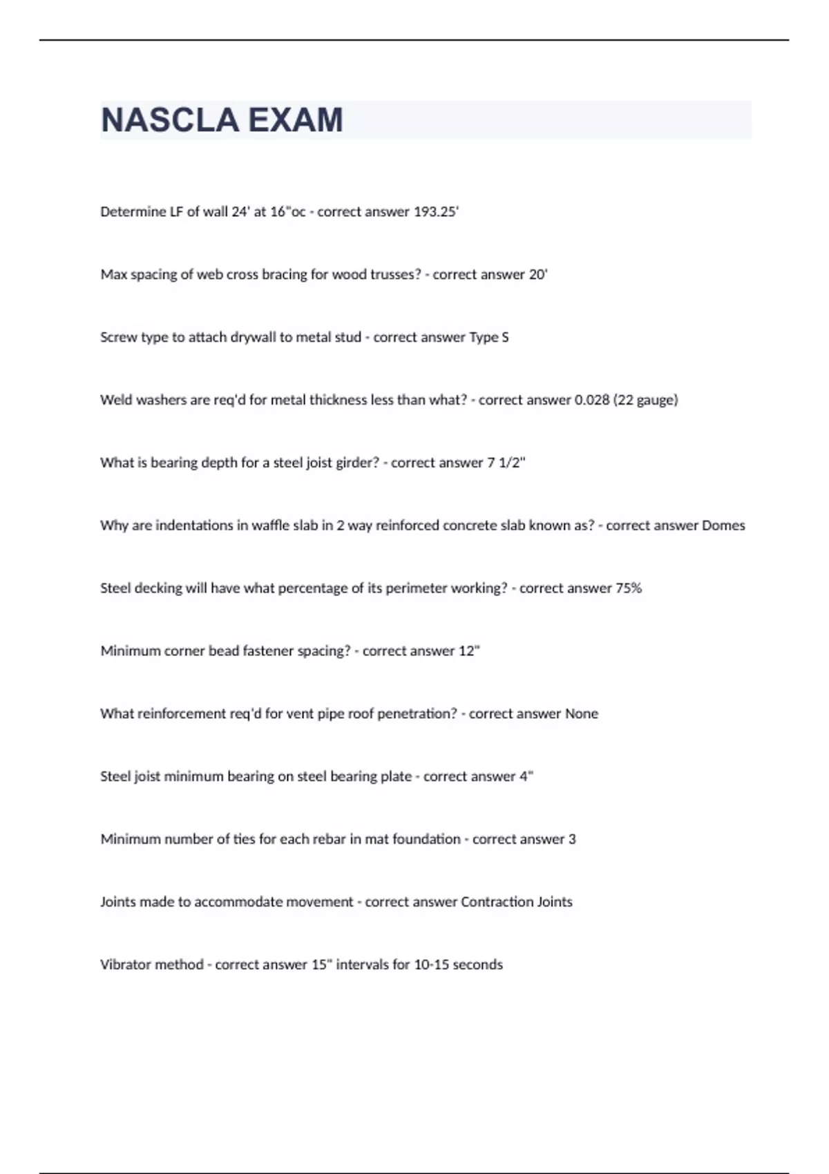 NASCLA EXAM Question and answers correctly solved 2023/2024Determine LF of wall 24' at 16"oc - correct answer 193.25' Max spacing of web cross bracing for wood trusses? - correct answer 20' Screw type to attach drywall to metal stud - correct answer Type S Weld washers are req'd for metal thickness less than what? - correct answer 0.028 (22 gauge) What is bearing depth for a steel joist girder? - correct answer 7 1/2"