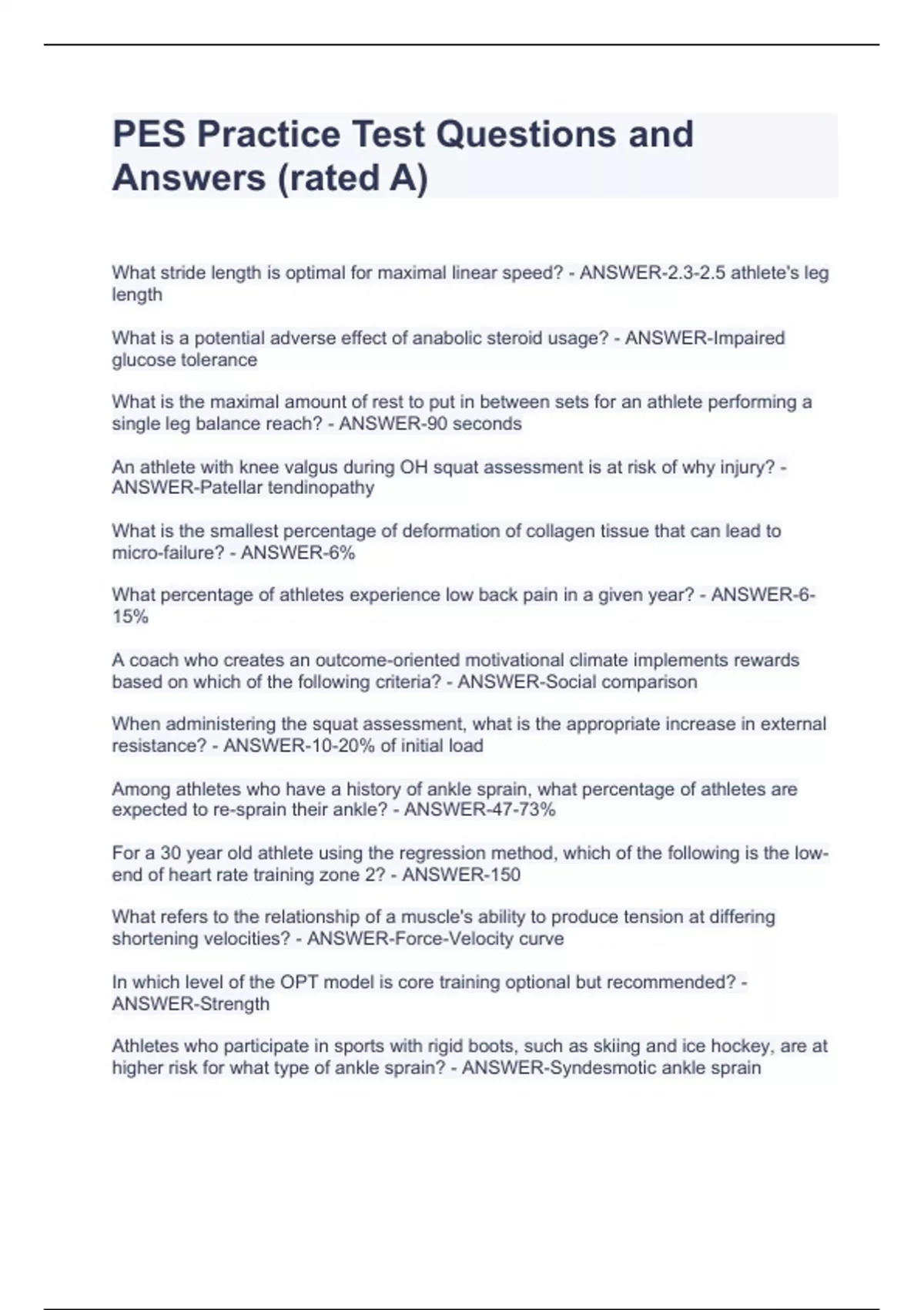 What is a potential adverse effect of anabolic steroid usage? - ANSWER-Impaired glucose tolerance What is the maximal amount of rest to put in between sets for an athlete performing a single leg balance reach? - ANSWER-90 seconds An athlete with knee valgus during OH squat assessment is at risk of why injury? - ANSWER-Patellar tendinopathy What is the smallest percentage of deformation of collagen tissue that can lead to micro-failure? - ANSWER-6% What percentage of athletes experience low back pain in a given year? - ANSWER-6-15% A coach who creates an outcome-oriented motivational climate implements rewards based on which of the following criteria? - ANSWER-Social comparison When administering the squat assessment, what is the appropriate increase in external resistance? - ANSWER-10-20% of initial load Among athletes who have a history of ankle sprain, what percentage of athletes are expected to re-sprain their ankle? - ANSWER-47-73% For a 30 year old athlete using the regression method, which of the following is the low-end of heart rate training zone 2? - ANSWER-150 What refers to the relationship of a muscle's ability to produce tension at differing shortening velocities? - ANSWER-Force-Velocity curve In which level of the OPT model is core training optional but recommended? - ANSWER-Strength Athletes who participate in sports with rigid boots, such as skiing and ice hockey, are at higher risk for what type of ankle sprain? - ANSWER-Syndesmotic ankle sprain