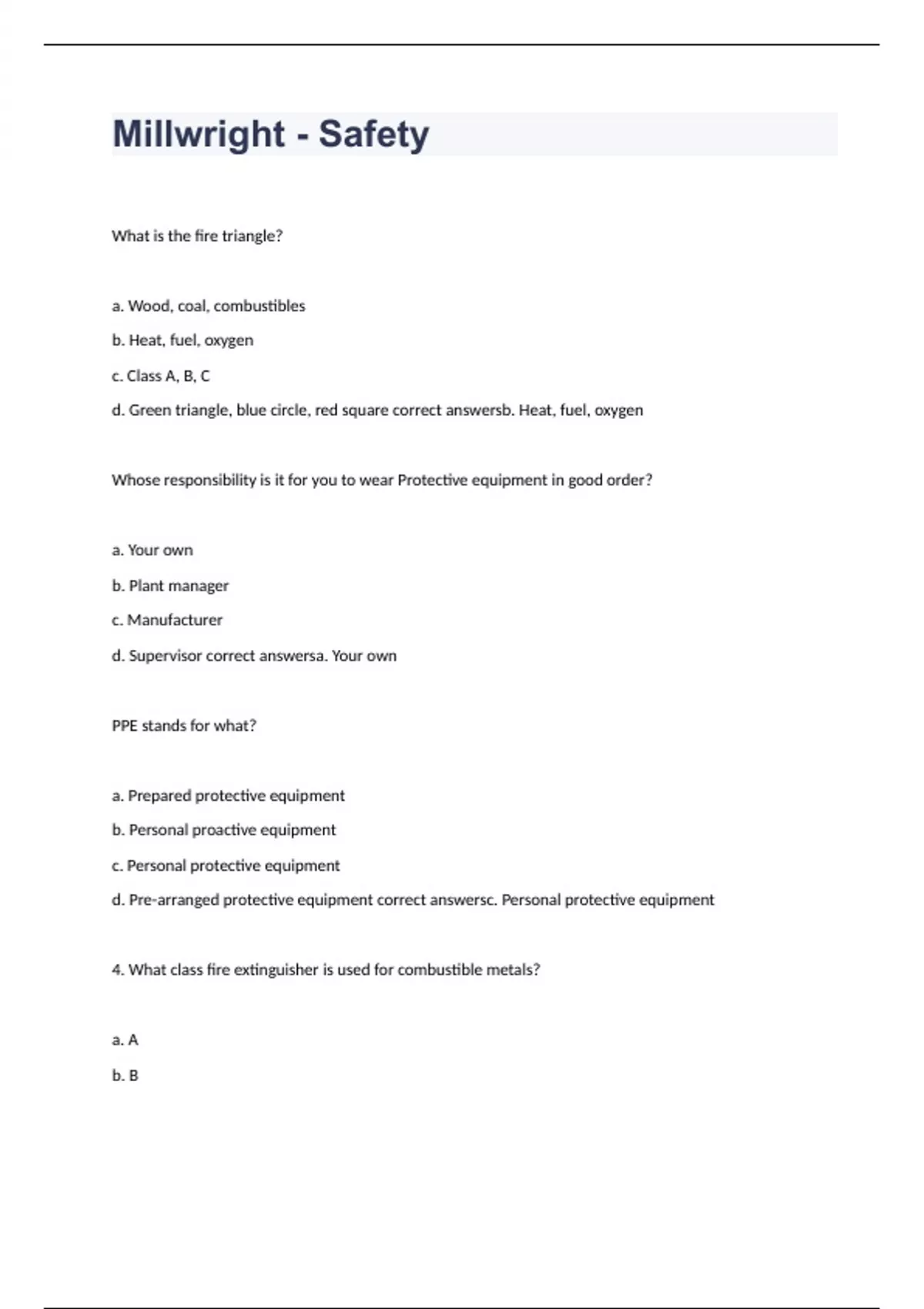 What is the fire triangle? a. Wood, coal, combustibles b. Heat, fuel, oxygen c. Class A, B, C d. Green triangle, blue circle, red square correct answersb. Heat, fuel, oxygen Whose responsibility is it for you to wear Protective equipment in good order? a. Your own b. Plant manager c. Manufacturer d. Supervisor correct answersa. Your own PPE stands for what? a. Prepared protective equipment b. Personal proactive equipment c. Personal protective equipment d. Pre-arranged protective equipment correct answersc. Personal protective equipment 4. What class fire extinguisher is used for combustible metals? a. A b. B