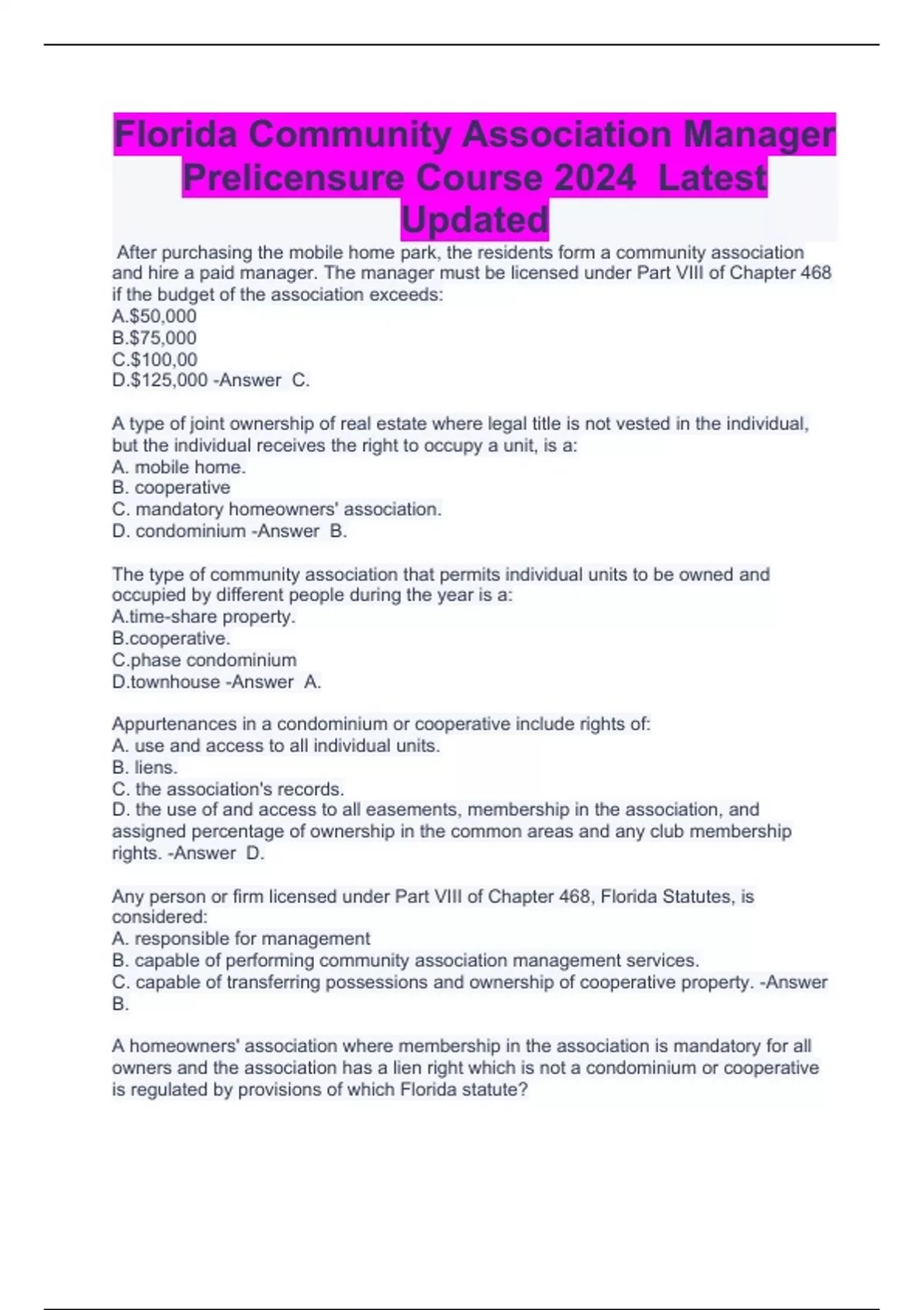 After purchasing the mobile home park, the residents form a community association and hire a paid manager. The manager must be licensed under Part VIII of Chapter 468 if the budget of the association exceeds: A.$50,000 B.$75,000 C.$100,00 D.$125,000 -Answer C. A type of joint ownership of real estate where legal title is not vested in the individual, but the individual receives the right to occupy a unit, is a: A. mobile home. B. cooperative C. mandatory homeowners' association. D. condominium -Answer B. The type of community association that permits individual units to be owned and occupied by different people during the year is a: A.time-share property. B.cooperative. C.phase condominium D.townhouse -Answer A. Appurtenances in a condominium or cooperative include rights of: A. use and access to all individual units. B. liens. C. the association's records. D. the use of and access to all easements, membership in the association, and assigned percentage of ownership in the common areas and any club membership rights. -Answer D. Any person or firm licensed under Part VIII of Chapter 468, Florida Statutes, is considered: A. responsible for management B. capable of performing community association management services. C. capable of transferring possessions and ownership of cooperative property. -Answer B. A homeowners' association where membership in the association is mandatory for all owners and the association has a lien right which is not a condominium or cooperative is regulated by provisions of which Florida statute? A. 648, F.S.