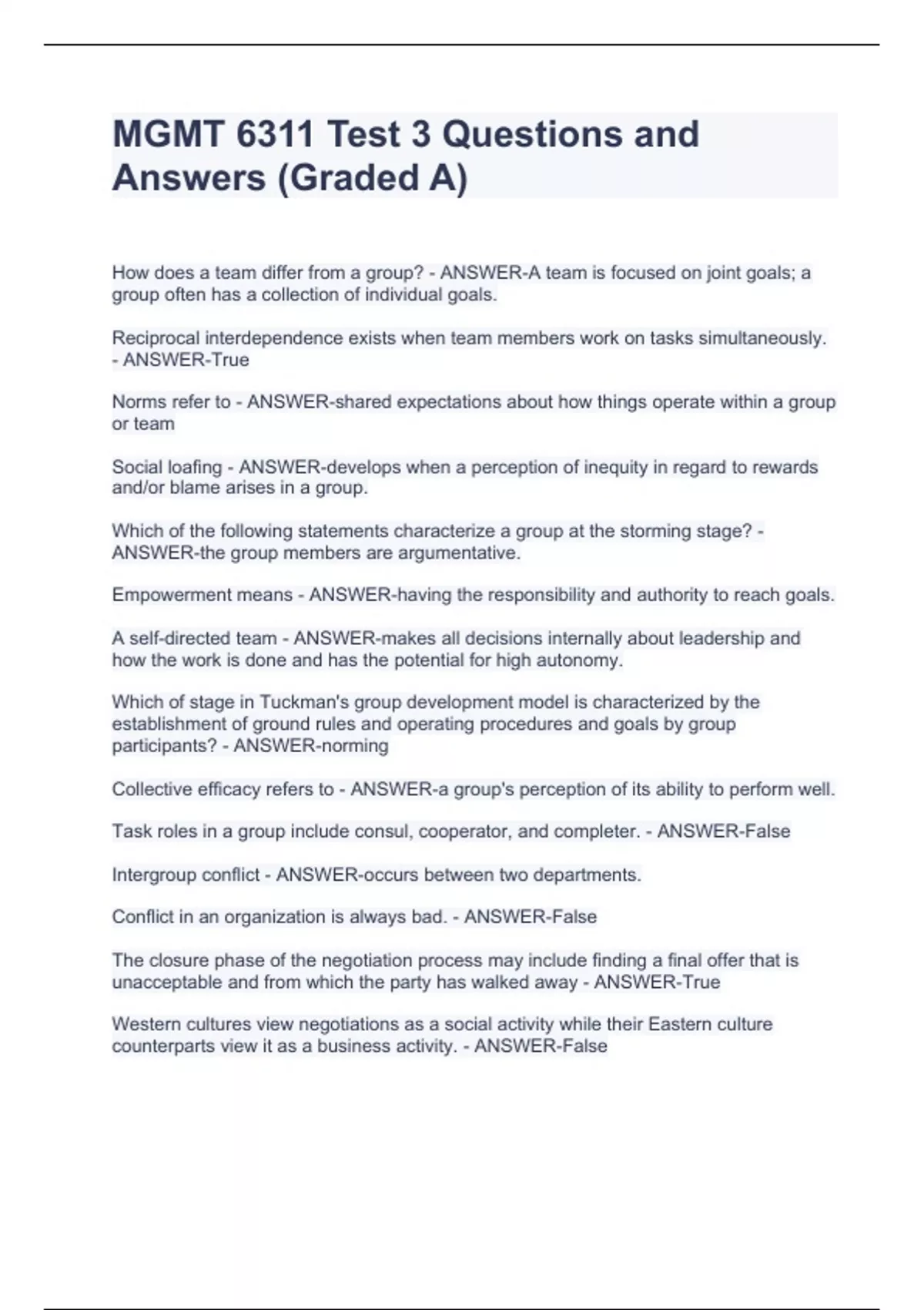 MGMT 6311 Test 3 Questions and Answers (Graded A) MGMT 6311 Test 3 Questions and Answers (Graded A) MGMT 6311 Test 3 Questions and Answers (Graded A) MGMT 6311 Test 3 Questions and Answers (Graded A) How does a team differ from a group? - ANSWER-A team is focused on joint goals; a group often has a collection of individual goals. Reciprocal interdependence exists when team members work on tasks simultaneously. - ANSWER-True Norms refer to - ANSWER-shared expectations about how things operate within a group or team Social loafing - ANSWER-develops when a perception of inequity in regard to rewards and/or blame arises in a group.