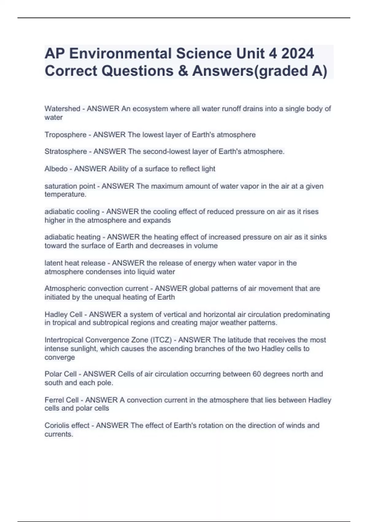 AP Environmental Science Unit 4 2024 Correct Questions & Answers(graded A)Watershed - ANSWER An ecosystem where all water runoff drains into a single body of water Troposphere - ANSWER The lowest layer of Earth's atmosphere Stratosphere - ANSWER The second-lowest layer of Earth's atmosphere. Albedo - ANSWER Ability of a surface to reflect light saturation point - ANSWER The maximum amount of water vapor in the air at a given temperature. adiabatic cooling - ANSWER the cooling effect of reduced pressure on air as it rises higher in the atmosphere and expands adiabatic heating - ANSWER the heating effect of increased pressure on air as it sinks toward the surface of Earth and decreases in volume latent heat release - ANSWER the release of energy when water vapor in the atmosphere condenses into liquid water Atmospheric convection current - ANSWER global patterns of air movement that are initiated by the unequal heating of Earth Hadley Cell - ANSWER a system of vertical and horizontal air circulation predominating in tropical and subtropical regions and creating major weather patterns. Intertropical Convergence Zone (ITCZ) - ANSWER The latitude that receives the most intense sunlight, which causes the ascending branches of the two Hadley cells to converge Polar Cell - ANSWER Cells of air circulation occurring between 60 degrees north and so