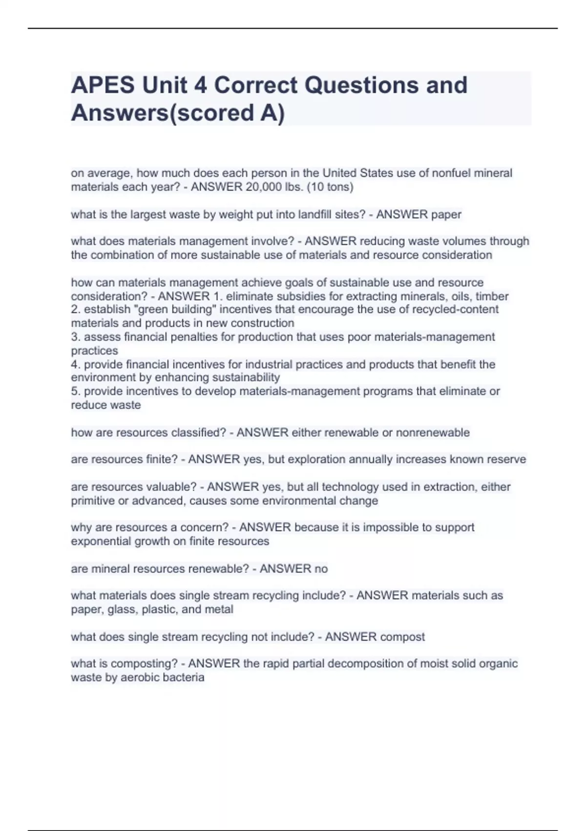APES Unit 4 Correct Question average, how much does each person in the United States use of nonfuel mineral materials each year? - ANSWER 20,000 lbs. (10 tons) what is the largest waste by weight put into landfill sites? - ANSWER paper what does materials management involve? - ANSWER reducing waste volumes through the combination of more sustainable use of materials and resource consideration how can materials management achieve goals of sustainable use and resource consideration? - ANSWER 1. eliminate subsidies for extracting minerals, oils, timber 2. establish "green building" incentives that encourage the use of recycled-content materials and products in new construction 3. assess financial penalties for production that uses poor materials-management practices 4. provide financial incentives for industrial practices and products that benefit the environment by enhancing sustainability 5. provide incentives to develop materials-management programs that eliminate or reduce waste how are resources classified? - ANSWER either renewable or nonrenewable are resources finite? - ANSWER yes, but exploration annually increases known reserve are resources valuable? - ANSWER yes, but all technology used in extraction, either primitive or advanced, causes some environmental change why are resources a concern? - ANSWER because it is impossible to support exponential growth on finite resources are mineral resources renewable? - ANSWER no what materials does single stream recycling include? - ANSWER materials such as paper, glass, plastic, and metal what does single stream recycling not include? - ANSWER compost what is composting? - ANSWER the rapid partial decomposition of moist solid organic waste by aerobic bacteria how does recycling influence the environmental impacts of mineral development? - ANSWER 1. decreases the amount of landfill sites 2. decreases the price of raw materials 3. decreased the quantities of raw materials mined from the earth 4. decreases the need to explore for new mineral reserves 5. decreases the quantity of waste what are some examples of metals that are being recycled in the US? - ANSWER iron, lead, copper, and aluminum why has Europe been more successful in recycling than the US? - ANSWER 1. landfill fees in Europe are much higher than in the US 2. the manufacturers are responsible for the disposal cost of packaging and industrial goods they produce what are some common ingredients of fertilizers? - ANSWER sulfur, calcium, potassium, nitrogen, and phosphorus what percent does ocean water contain of dissolved solids? and what are some e ons and Answers(scored A)