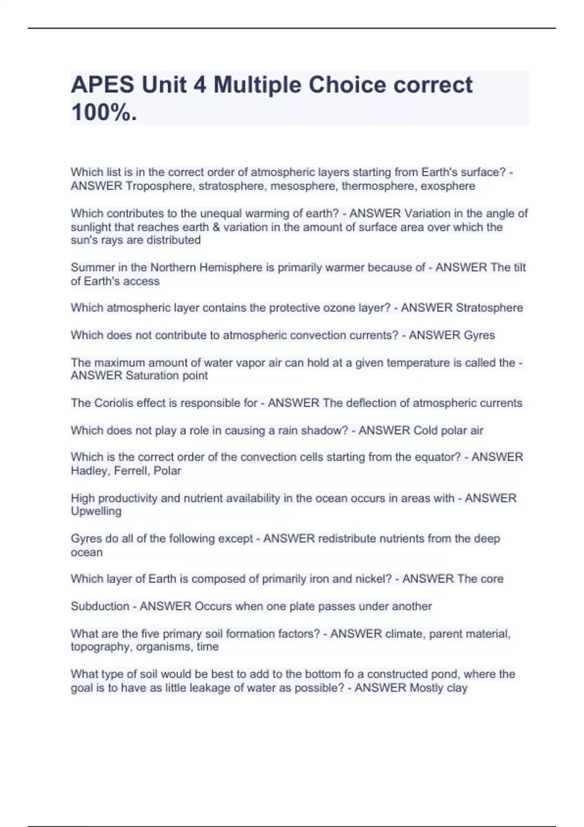 APES Unit 4 Multiple Choice correct 100%. Which list is in the correct order of atmospheric layers starting from Earth's surface? - ANSWER Troposphere, stratosphere, mesosphere, thermosphere, exosphere Which contributes to the unequal warming of earth? - ANSWER Variation in the angle of sunlight that reaches earth & variation in the amount of surface area over which the sun's rays are distributed Summer in the Northern Hemisphere is primarily warmer because of - ANSWER The tilt of Earth's access Which atmospheric layer contains the protective ozone layer? - ANSWER Stratosphere Which does not contribute to atmospheric convection currents? - ANSWER Gyres The maximum amount of water vapor air can hold at a given temperature is called the - ANSWER Saturation point The Coriolis effect is responsible for - ANSWER The deflection of atmospheric currents Which does not play a role in causing a rain shadow? - ANSWER Cold polar air Which is the correct order of the convection cells starting from the equator? - ANSWER Hadley, Ferrell, Polar High productivity and nutrient availability in the ocean occurs in areas with - ANSWER Upwelling