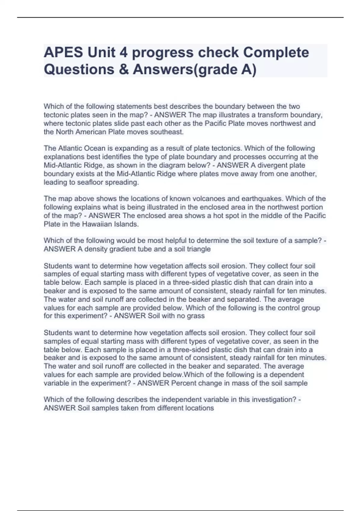 APES Unit 4 progress check CompleteWhich of the following statements best describes the boundary between the two tectonic plates seen in the map? - ANSWER The map illustrates a transform boundary, where tectonic plates slide past each other as the Pacific Plate moves northwest and the North American Plate moves southeast. The Atlantic Ocean is expanding as a result of plate tectonics. Which of the following explanations best identifies the type of plate boundary and processes occurring at the Mid-Atlantic Ridge, as shown in the diagram below? - ANSWER A divergent plate boundary exists at the Mid-Atlantic Ridge where plates move away from one another, leading to seafloor spreading. The map above shows the locations of known volcanoes and earthquakes. Which of the following explains what is being illustrated in the enclosed area in the northwest portion of the map? - ANSWER The enclosed area shows a hot spot in the middle of the Pacific Plate in the Hawaiian Islands. Which of the following would be most helpful to determine the soil texture of a sample? - ANSWER A density gradient tube and a soil triangle Students want to determine how vegetation affects soil erosion. They collect four soil samples of equal starting mass with different types of vegetative cover, as seen in the table below. Each sample is placed in a three-sided plastic dish that can drain into a beaker and is exposed to the same amount of consistent, steady rainfall for ten minutes. The water and soil runoff are collected in the beaker and separated. The average values for each sample are provided below. Which of the following is the control group for this experiment? - ANSWER Soil with no grass Students want to determine how vegetation affects soil erosion. They collect four soil samples of equal starting mass with different types of vegetative cover, as seen in the table below. Each sample is placed in a three-sided plastic dish that can drain into a beaker and is exposed to the same amount of consistent, steady rainfall for ten minutes. The water and soil runoff are collected in the beaker and separated. The average values Questions & Answers(grade A)