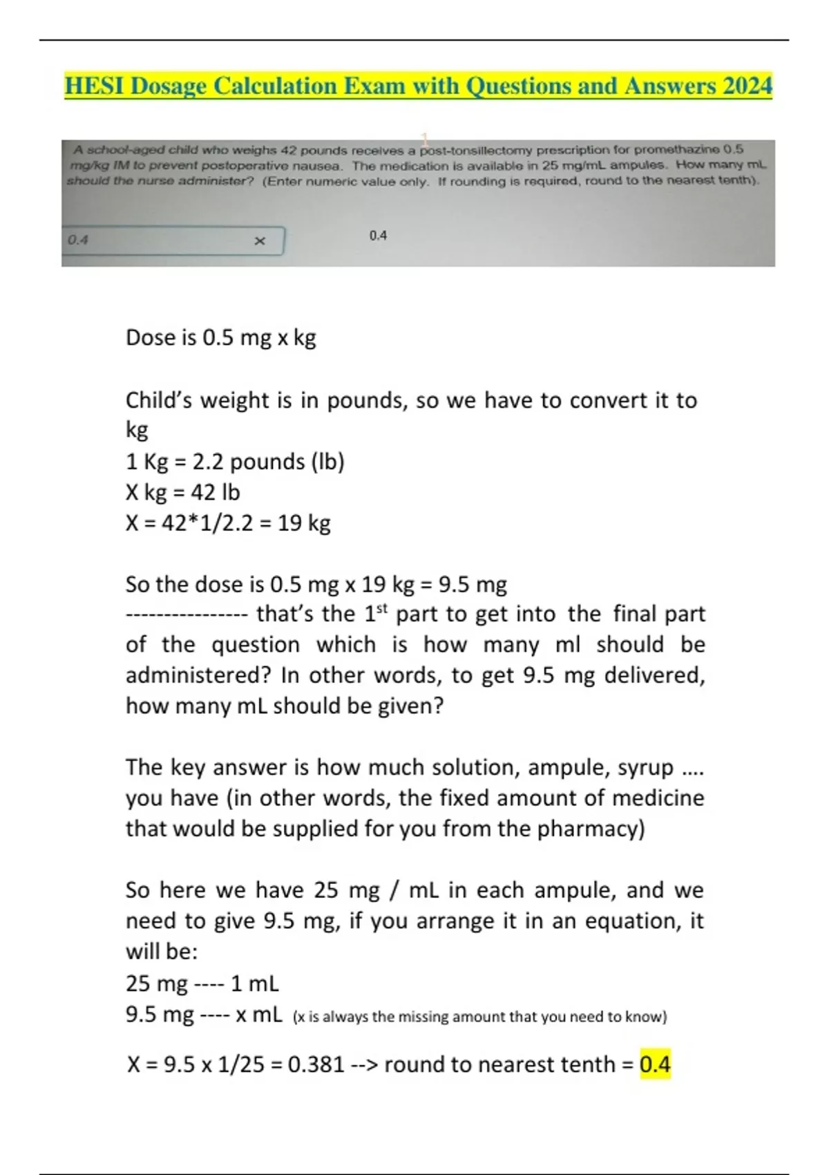 HESI Dosage Calculation Exam with Questions and Answers 2024 Dose is 0.5 mg x kg Child’s weight is in pounds, so we have to convert it to kg 1 Kg = 2.2 pounds (lb) X kg = 42 lb X = 42*1/2.2 = 19 kg So the dose is 0.5 mg x 19 kg = 9.5 mg ---------------- that’s the 1st part to get into the final part of the question which is how many ml should be administered? In other words, to get 9.5 mg delivered, how many mL should be given? The key answer is how much solution, ampule, syrup …. you have (in other words, the fixed a mount of medicine that would be supplied for you from the pharmacy) So here we have 25 mg / mL in each ampule, and we need to give 9.5 mg, if you arrange it in an equation, it will be: 25 mg ---- 1 mL 9.5 mg ---- x mL (x is always the missing amount that you need to know) X = 9.5 x 1/25 = 0.381 --> round to nearest tenth = 0.4 1 Question: the healthcare provider prescribes captopril 37.5 mg PO daily. The medication is available in 25 mg tablets. How many tablets should the nurse administer? (Enter numeric only, if rounding is required, round to the nearest tenth). This should be the easiest questions and sometimes you don’t even need to use the calculator, imagine you have a medicine regardless of its name, and it comes in strength of 25 mg, you need to give 37.5 mg, both are same units, so your main concern is how to get 37.5 out of 25? just divide them! And you will get 1.5 tablets! Easy and straight! After you have the answer, just double check yourself, and imagine you have the medicine next to you, and you have 1 tablet of 25 mg and half tablet of 25 mg which is 12.5mg, add them together, 25 + 12.5 = 37.5, which what we need! So your answer is correct! Let’s move to the next quest ion! 3 Question: The PN administers amoxicillin/clavulanate 500 mg PO every 8 hours to a client with a staphylococcus infection. In a 24 hour period. How many mg of amoxicillin/clavulanate should the client receive? (Enter the numerical value only. If rounding is required, round to the whole number.) If you don’t have a good pharmacology/microbiology background, don’t freak out! Just ignore the name of medications/bacteria. 99% they have nothing to do in calculation questions! Just understand the question and you will have the answer by your self! You are talking a medicine with a strength of 500 mg every 8 hours, how many mg you will take in 24 hours? So in other word, how many 8 hours are there in 24 hours? 3! 500 mg x 3 = 1500 mg! Easy! Next… 4 Question: A client is prescribed carbidopa -levodopa 20/200 mg PO BID. The pharmacy delivers carbidopa -levodopa 10/100 mg tablets. The nurse should administer how many tablets at each dose? (Enter the numeric value only. If rounding is required, round to the whole number.) To answer these questions, you should understand the question correctly, make sure you understand the different between how many tablet should be taken at each dose vs how many tablets should be taken per day or every 24 hours. Some questions might trick you with this. So back to our question, you need to give a medicine with a strength of 20/200 but the pharmacy supplied you with a strength of 10/100 of the same medicine, how many tablets you will administer in each dose? The answer is 2 ! and that what the question asked for! Assume the question asks for the 24 dosage? The answer would be 2 tablets BID, which is 4 tablets. Practice make it easy! Let’s move to the next one!