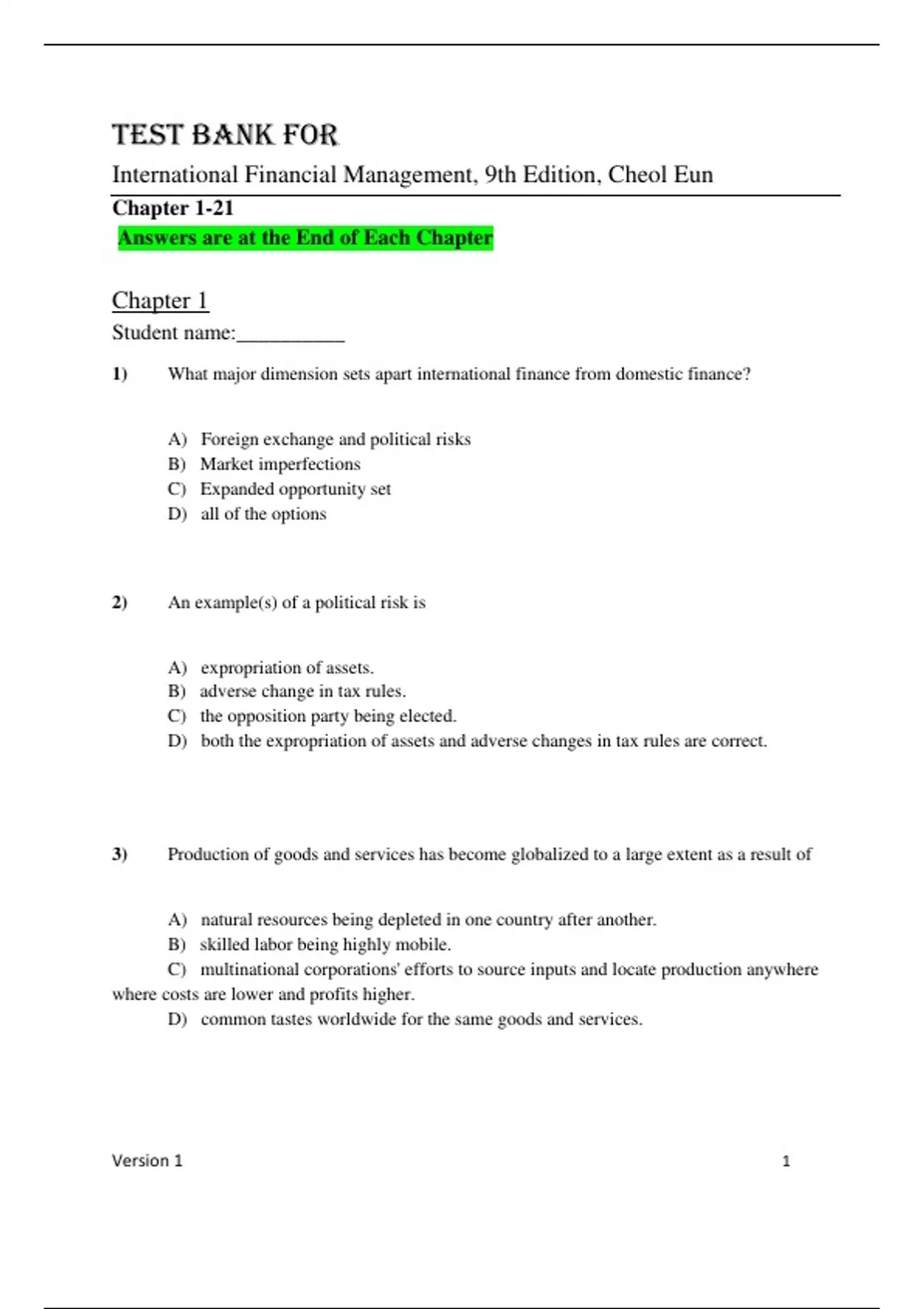 Test Bank For International Financial Management, 9th Edition, by Cheol Eun Chapter 1-21