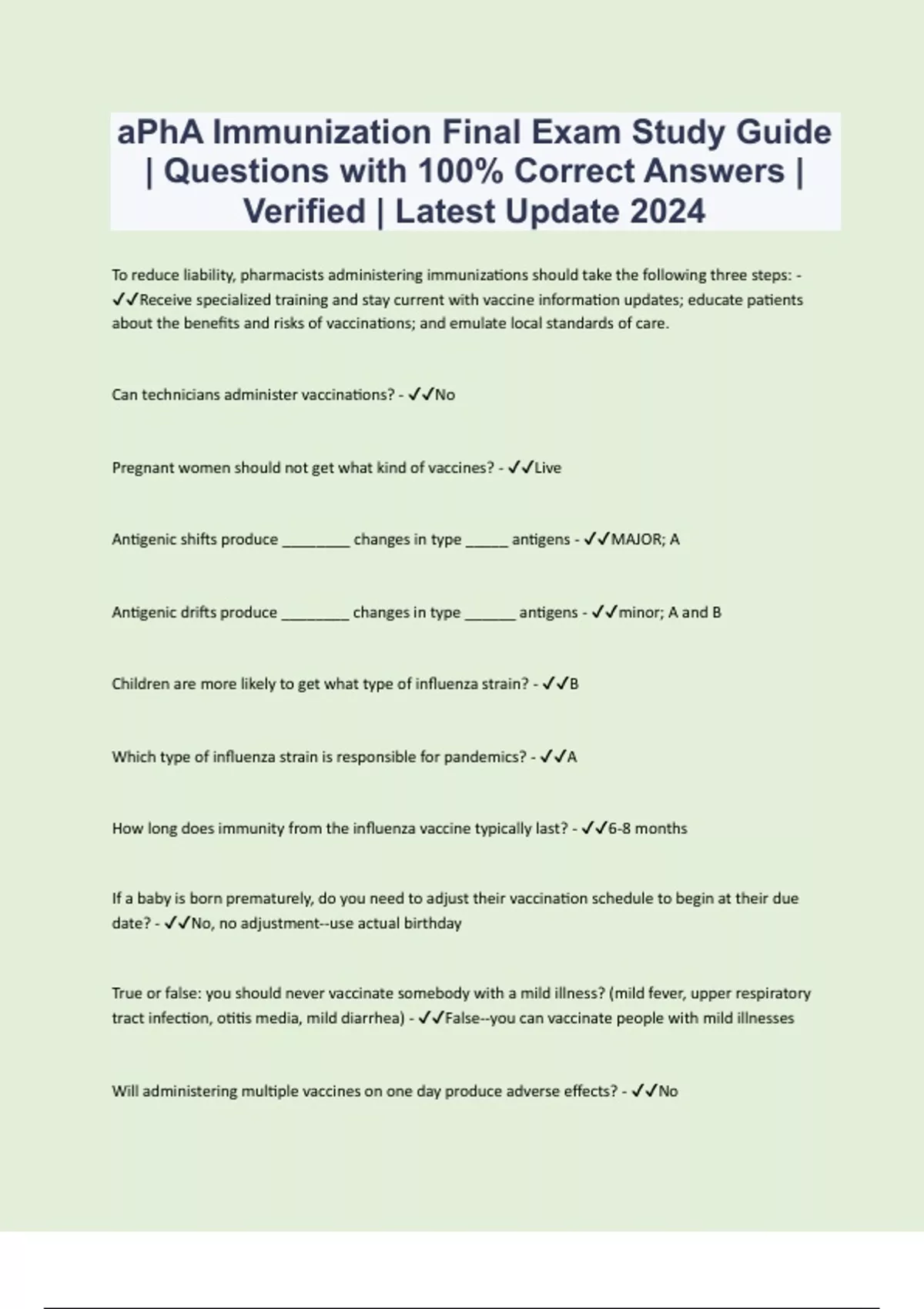 aPhA Immunization Final Exam Study Guide | Questions with 100% Correct Answers | Verified | Latest Update 2024