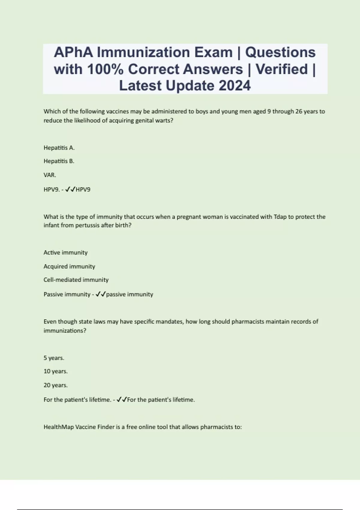 APhA Immunization Exam | Questions with 100% Correct Answers | Verified | Latest Update 2024