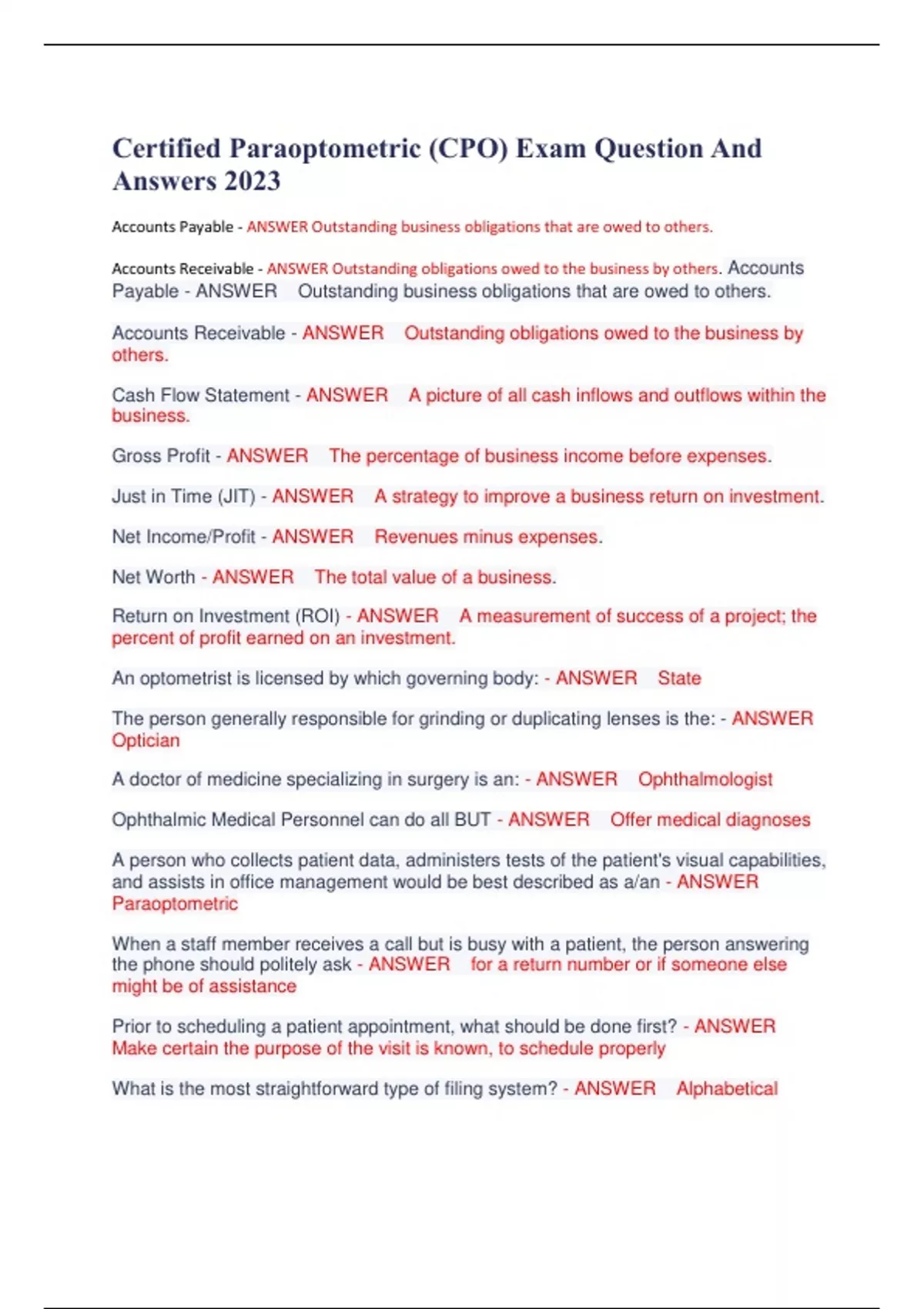 Certified Paraoptometric (CPO) Exam Question And Answers 2023 Accounts Payable - ANSWER Outstanding business obligations that are owed to others. Accounts Receivable - ANSWER Outstanding obligations owed to the business by others. Accounts Payable - ANSWER Outstanding business obligations that are owed to others. Accounts Receivable - ANSWER Outstanding obligations owed to the business by others. Cash Flow Statement - ANSWER A picture of all cash inflows and outflows within the business. Gross Profit - ANSWER The percentage of business income before expenses. Just in Time (JIT) - ANSWER A strategy to improve a business return on investment. Net Income/Profit - ANSWER Revenues minus expenses. Net Worth - ANSWER The total value of a business. Return on Investment (ROI) - ANSWER A measurement of success of a project; the percent of profit earned on an investment. An optometrist is licensed by which governing body: - ANSWER State The person generally responsible for grinding or duplicating lenses is the: - ANSWER Optician A doctor of medicine specializing in surgery is an: - ANSWER Ophthalmologist Ophthalmic Medical Personnel can do all BUT - ANSWER Offer medical diagnoses A person who collects patient data, administers tests of the patient's visual capabilities, and assists in office management would be best described as a/an - ANSWER Paraoptometric When a staff member receives a call but is busy with a patient, the person answering the phone should politely ask - ANSWER for a return number or if someone else might be of assistance Prior to scheduling a patient appointment, what should be done first? - ANSWER Make certain the purpose of the visit is known, to schedule properly What is the most straightforward type of filing system? - ANSWER Alphabetical Which is not a part of implementing HIPAA? - ANSWER Unlimited PHI disclosure for staff developing crisis. Which is not required for documentation of released PHI? - ANSWER Age, name, password Ciliary Muscle - ANSWER The muscle inside of the eyeball that alters the shape of the crystalline lens. It has direct control over the focusing ability of the eye. Medial Rectus - ANSWER The most powerful of the extraocular muscles. Turns the eye toward the nose. Inferior Rectus - ANSWER Its primary action is to turn the eye downward. Lateral Rectus - ANSWER Its only action is to move the eyes away from the nose. Superior Rectus - ANSWER Its primary action is to move the eye upward. Superior Oblique - ANSWER Rotates eye down and inward Inferior Oblique - ANSWER Rotates eye up and outward Anterior Chamber - ANSWER The area inside the eye, behind the cornea, and in front of the iris. Aqueous humor - ANSWER a clear, watery fluid produced by the ciliary body. It provides nutrients for the lens and posterior cornea. Choroid - ANSWER Sandwiched between the sclera and the retina. This nourishes the retina. Conjunctiva - ANSWER clear, cellophane-like tissue that covers the sclera and the inside surface of the eyelids. The *palpebral* _______ lines the lids, while the *bulbar* _______ covers the sclera. Fovea Centralis - ANSWER Area in the macula where visual acuity is the sharpest. Macula - ANSWER The central part of the retina, which is used for seeing detail. Posterior Chamber - ANSWER The area behind the iris and in front of the lens. Rods - ANSWER Photoreceptors that provide black/white vision and are the most sensitive. Cones - ANSWER Photoreceptors responsible for color vision and for clear central vision. Sclera - ANSWER The white portion of the eye made up of a tough, fibrous tissue that gives shape and structure to the eyeball. Vitreous Humor - ANSWER A thick, clear, jelly-like substance that fills the eye between the lens and the retina. This serves to support the retina and helps keep the eye round. Ocular Adnexa - ANSWER The adjacent structures of the eye, such as eyelids, lashes, eyebrows, lacrimal apparatus, tarsal plates, orbit, extraocular muscles and conjunctiva. Sinuses - ANSWER Air spaces within the bones. Lacrimal Gland - ANSWER The gland that supplies most of the tears to the eye. Lacrimal Duct - ANSWER The drainage system for tears. Nasolacrimal Duct - ANSWER The drainage system for the tears to leave the eye. Amblyopia - ANSWER A loss of vision in one or both eyes. Aphakia - ANSWER When a cataract progress to the degree that it interferes with vision, the crystalline lens can be surgically removed. Absence of the lens in the eye. Chalazion - ANSWER As the inflammation resolves in a hordeolum, it will sometimes leave a granuloma (small lump). Blepharitis - ANSWER Inflammation of the lid margin. Diabetic Retinopathy - ANSWER Due to poor blood circulation that occurs with diabetes mellitus, new blood vessel growth often develops in the retina. Esotropia - ANSWER A form of strabismus in which one or both eyes turn inward. Flashes or floaters - ANSWER Caused by mechanical stimulation of the nerves in the retina. Glaucoma - ANSWER A condition in which the optic nerve is damaged from increased ocular pressure. Hordeolum - ANSWER Commonly known as a stye, occurs when pores in the eyelid become blocked and inflamed. This essentially is a "pimple" in the eyelid. Keratoconus - ANSWER The cornea thins and bulges forward. Nystagmus - ANSWER A vision condition in which the eyes make repetitive, uncontrolled movements, often resulting in reduced vision. Pinguecula - ANSWER A thickening of the connective tissue on the sides of the cornea (3 and 9 o'clock). Ptygerium - ANSWER A type of abnormal growth of tissue on the conjunctiva.