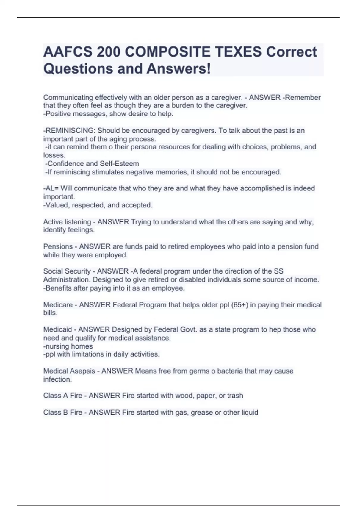 AAFCS 200 COMPOSITE TEXESCommunicating effectively with an older person as a caregiver. - ANSWER -Remember that they often feel as though they are a burden to the caregiver. -Positive messages, show desire to help. -REMINISCING: Should be encouraged by caregivers. To talk about the past is an important part of the aging process. -it can remind them o their persona resources for dealing with choices, problems, and losses. -Confidence and Self-Esteem -If reminiscing stimulates negative memories, it should not be encouraged. -AL= Will communicate that who they are and what they have accomplished is indeed important. -Valued, respected, and accepted. Active listening - ANSWER Trying to understand what the others are saying and why, identify feelings. Pensions - ANSWER are funds paid to retired employees who paid into a pension fund while they were employed. Social Security - ANSWER -A federal program under the direction of the SS Administration. Designed to give retired or disabled individuals some source of income. -Benefits after paying into it as an employee. Medicare - ANSWER Federal Program that helps older ppl (65+) in paying their medical bills. Medicaid - ANSWER Designed by Federal Govt. as a state program to hep those who need and qualify for medical assistance. -nursing homes -ppl with limitations in daily activities. Medical Asepsis - ANSWER Means free from germs o bacteria that may cause infection. Class A Fire - ANSWER Fire started with wood, paper, or trash Class B Fire - ANSWER Fire started with gas, grease or other liquid Class C Fire - ANSWER Electircal fire First Degree Burn - ANSWER Skin Reddened but unbroken FA: Place under cold Water Second Degree Burn - ANSWER Skin Reddened, blisters formed FA: Place under cod water, cover with a dry sterie dressing. Third Degree Burn - ANSWER Skin Partially destroyed FA: Cover entire area with a dry sterile dressing. Consumer Product Safety Commission - ANSWER -Charged to protect the consumers fr Correct Questions and Answers!