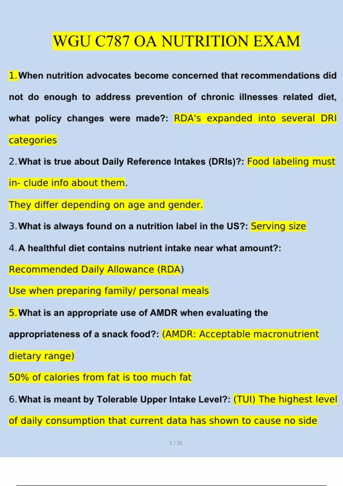 WGU C787 OA Nutrition Exam BUNDLED WGU C787 Nutrition WGU C787 Health and Wellness Through Nutritional Science Questions and Answers (2024/2025)(Verified Answers)