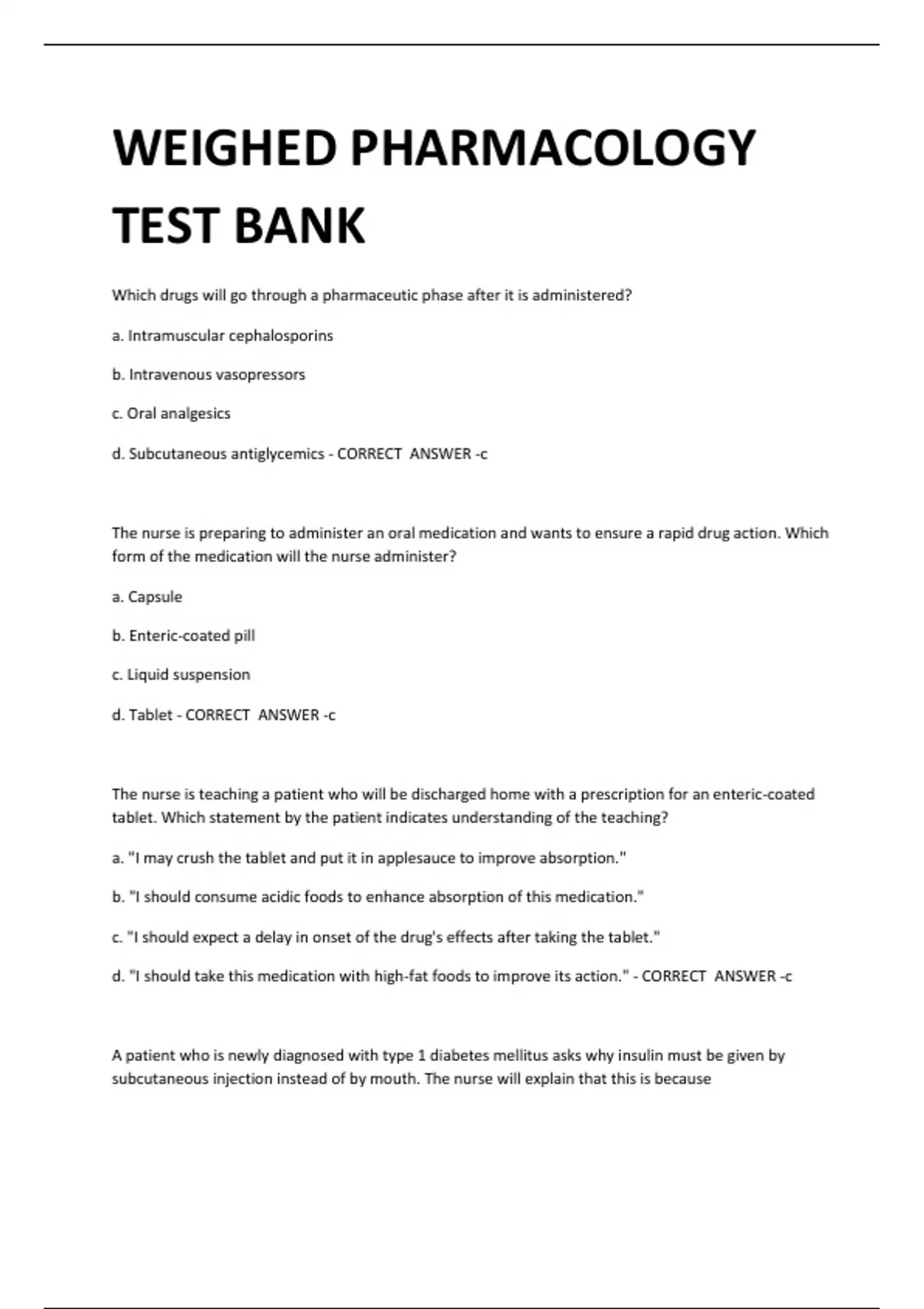 WEIGHED PHARMACOLOGY TEST BANK Which drugs will go through a pharmaceutic phase after it is administered? a. Intramuscular cephalosporins b. Intravenous vasopressors c. Oral analgesics d. Subcutaneous antiglycemics - CORRECT ANSWER -c The nurse is preparing to administer an oral medication and wants to ensure a rapid drug action. Which form of the medication will the nurse administer? a. Capsule b. Enteric-coated pill c. Liquid suspension d. Tablet - CORRECT ANSWER -c The nurse is teaching a patient who will be discharged home with a prescription for an enteric-coated tablet. Which statement by the patient indicates understanding of the teaching? a. "I may crush the tablet and put it in applesauce to improve absorption." b. "I should consume acidic foods to enhance absorption of this medication." c. "I should expect a delay in onset of the drug's effects after taking the tablet." d. "I should take this medication with high-fat foods to improve its action." - CORRECT ANSWER -c A patient who is newly diagnosed with type 1 diabetes mellitus asks why insulin must be given by subcutaneous injection instead of by mouth. The nurse will explain that this is because a. absorption is diminished by the first-pass effects in the liver. b. absorption is faster when insulin is given subcutaneously. c. digestive enzymes in the gastrointestinal tract prevent absorption. d. the oral form is less predictable with more adverse effects. - CORRECT ANSWER -c The nurse is preparing to administer an oral medication that is water-soluble. The nurse understands that this drug a. must be taken on an empty stomach. b. requires active transport for absorption. c. should be taken with fatty foods. d. will readily diffuse into the gastrointestinal tract. - CORRECT ANSWER -b A nurse is preparing to administer an oral drug that is best absorbed in an acidic environment. How will the nurse give the drug? a. On an empty stomach b. With a full glass of water c. With food d. With high-fat food - CORRECT ANSWER -c The nurse is preparing an injectable drug and wants to administer it for rapid absorption. How will the nurse give this medication? a. IM into the deltoid muscle b. IM into the gluteal muscle c. SubQ into abdominal tissue d. SubQ into the upper arm - CORRECT ANSWER -a