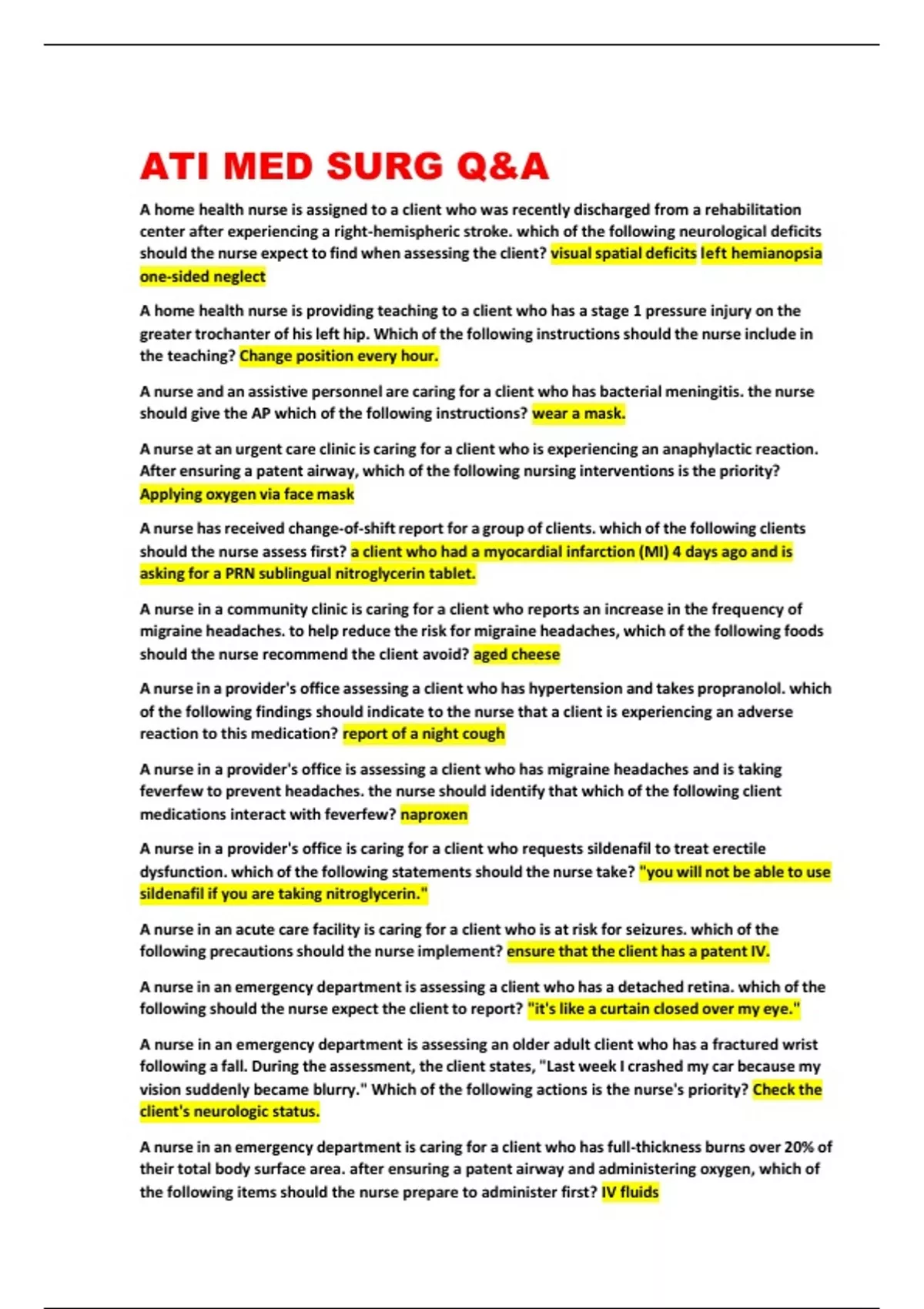 ATI MED SURG Q&A A home health nurse is assigned to a client who was recently discharged from a rehabilitation center after experiencing a right-hemispheric stroke. which of the following neurological deficits should the nurse expect to find when assessing the client? visual spatial deficits left hemianopsia one-sided neglect A home health nurse is providing teaching to a client who has a stage 1 pressure injury on the greater trochanter of his left hip. Which of the following instructions should the nurse include in the teaching? Change position every hour. A nurse and an assistive personnel are caring for a client who has bacterial meningitis. the nurse should give the AP which of the following instructions? wear a mask. A nurse at an urgent care clinic is caring for a client who is experiencing an anaphylactic reaction. After ensuring a patent airway, which of the following nursing interventions isthe priority? Applying oxygen via face mask A nurse hasreceived change-of-shift report for a group of clients. which of the following clients should the nurse assess first? a client who had a myocardial infarction (MI) 4 days ago and is asking for a PRN sublingual nitroglycerin tablet. A nurse in a community clinic is caring for a client who reports an increase in the frequency of migraine headaches. to help reduce the risk for migraine headaches, which of the following foods should the nurse recommend the client avoid? aged cheese A nurse in a provider's office assessing a client who has hypertension and takes propranolol. which of the following findings should indicate to the nurse that a client is experiencing an adverse reaction to this medication? report of a night cough A nurse in a provider's office is assessing a client who has migraine headaches and is taking feverfew to prevent headaches. the nurse should identify that which of the following client medications interact with feverfew? naproxen A nurse in a provider's office is caring for a client who requests sildenafil to treat erectile dysfunction. which of the following statements should the nurse take? "you will not be able to use sildenafil if you are taking nitroglycerin." A nurse in an acute care facility is caring for a client who is at risk for seizures. which of the following precautions should the nurse implement? ensure that the client has a patent IV. A nurse in an emergency department is assessing a client who has a detached retina. which of the following should the nurse expect the client to report? "it's like a curtain closed over my eye." A nurse in an emergency department is assessing an older adult client who has a fractured wrist following a fall. During the assessment, the client states, "Last week I crashed my car because my vision suddenly became blurry." Which of the following actions is the nurse's priority? Check the client's neurologic status. A nurse in an emergency department is caring for a client who has full-thickness burns over 20% of their total body surface area. after ensuring a patent airway and administering oxygen, which of the following items should the nurse prepare to administer first? IV fluids