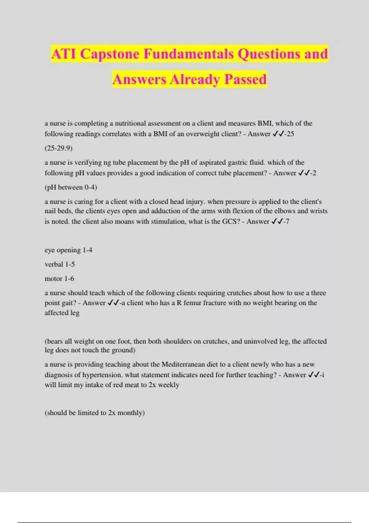 ATI Capstone Fundamentals Questions and Answers Already Passed a nurse is completing a nutritional assessment on a client and measures BMI, which of the following readings correlates with a BMI of an overweight client? - Answer ️️ -25 (25-29.9) a nurse is verifying ng tube placement by the pH of aspirated gastric fluid. which of the following pH values provides a good indication of correct tube placement? - Answer ️️ -2 (pH between 0-4) a nurse is caring for a client with a closed head injury. when pressure is applied to the client's nail beds, the clients eyes open and adduction of the arms with flexion of the elbows and wrists is noted. the client also moans with stimulation, what is the GCS? - Answer ️️ -7 eye opening 1-4 verbal 1-5 motor 1-6 a nurse should teach which of the following clients requiring crutches about how to use a three point gait? - Answer ️️ -a client who has a R femur fracture with no weight bearing on the affected leg (bears all weight on one foot, then both shoulders on crutches, and uninvolved leg, the affected leg does not touch the ground) a nurse is providing teaching about the Mediterranean diet to a client newly who has a new diagnosis of hypertension. what statement indicates need for further teaching? - Answer ️️ -i will limit my intake of red meat to 2x weekly (should be limited to 2x monthly)