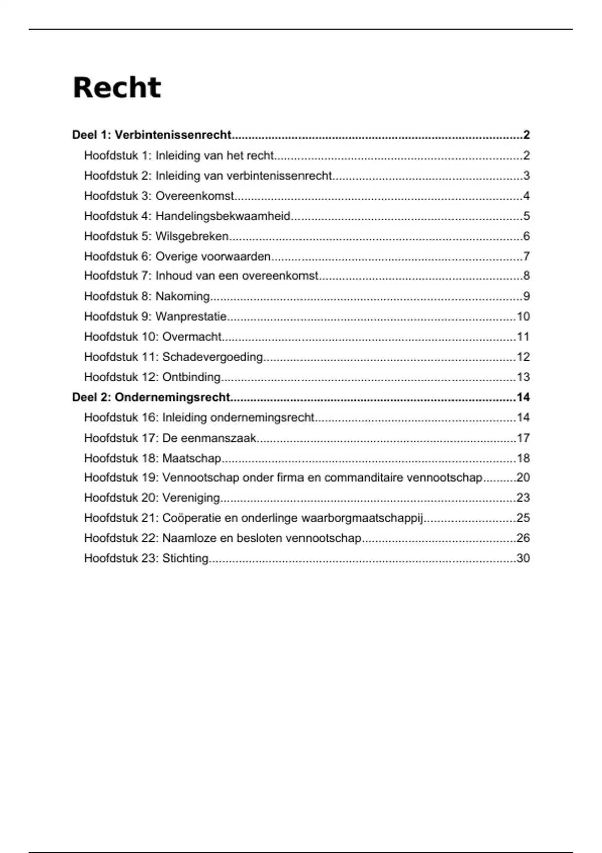Het betreft een samenvatting van verbintenissen- en ondernemingsrecht, aan de hand van het boek, de wetbundel en de aantekeningen uit de les. Het is een gestructureerde samenvatting, waarbij ook verwezen wordt naar de bijhorende wetten uit de wetbundel.